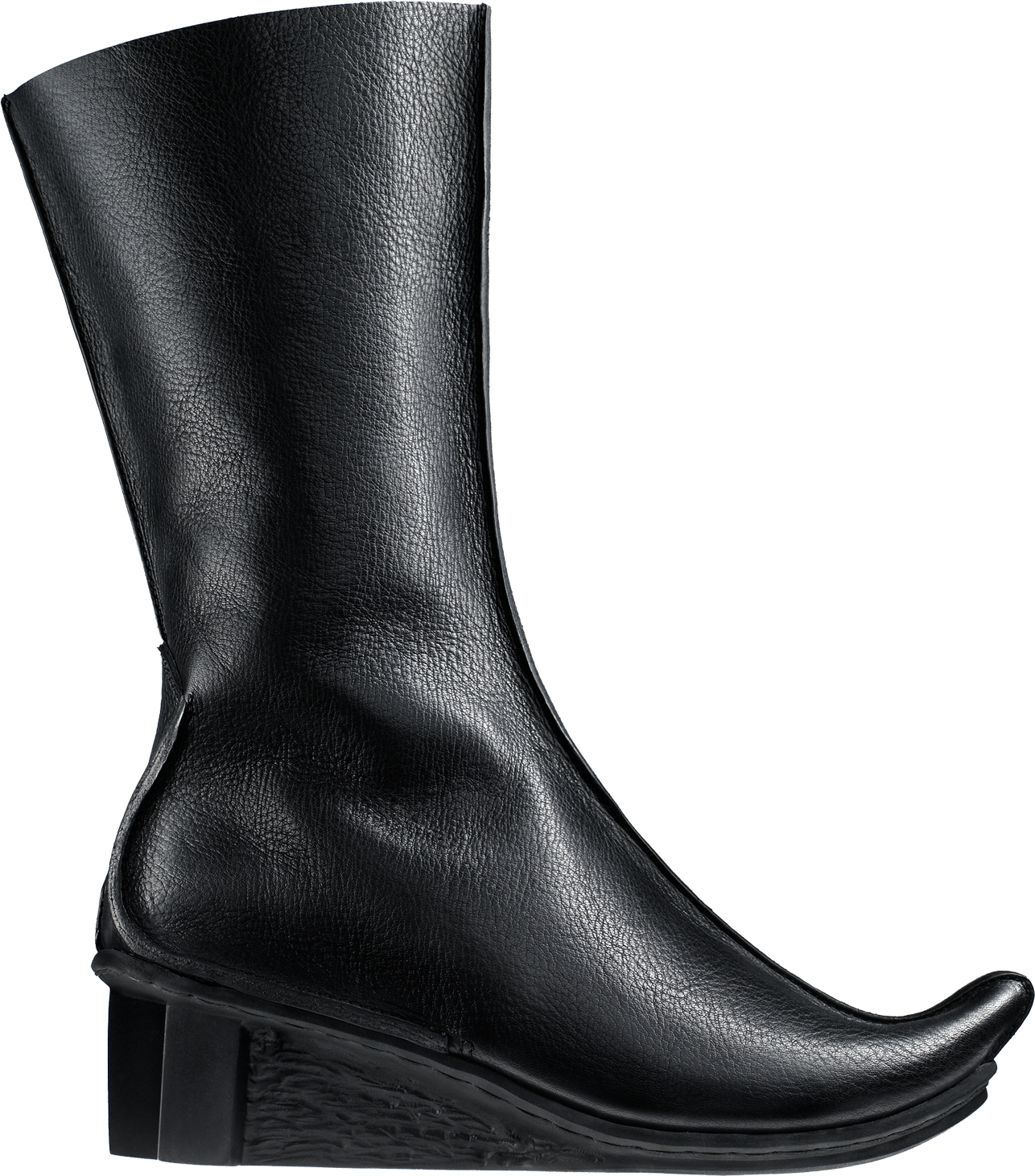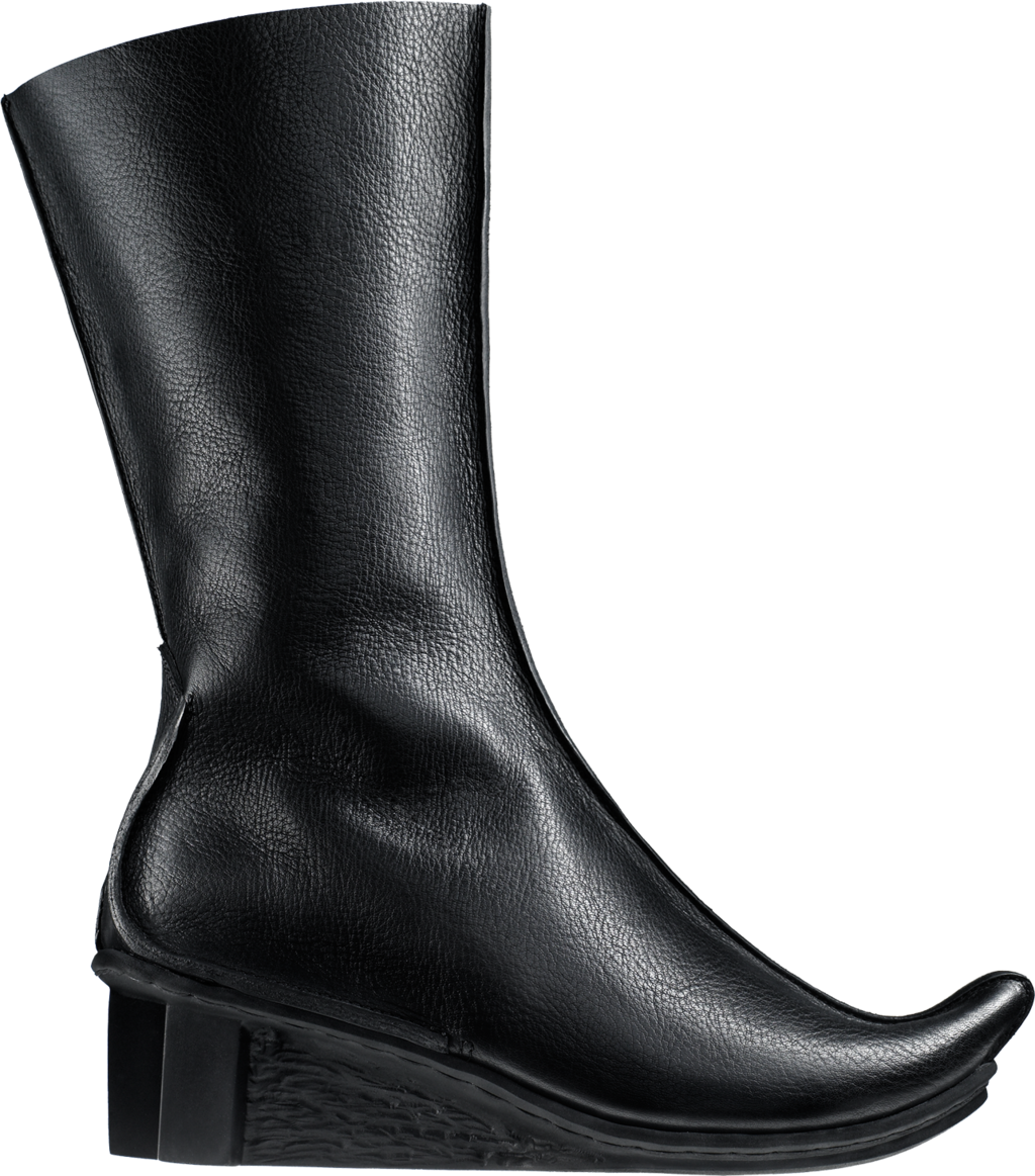 Calf-length boot with small pointy toe and long inner zip fastener.