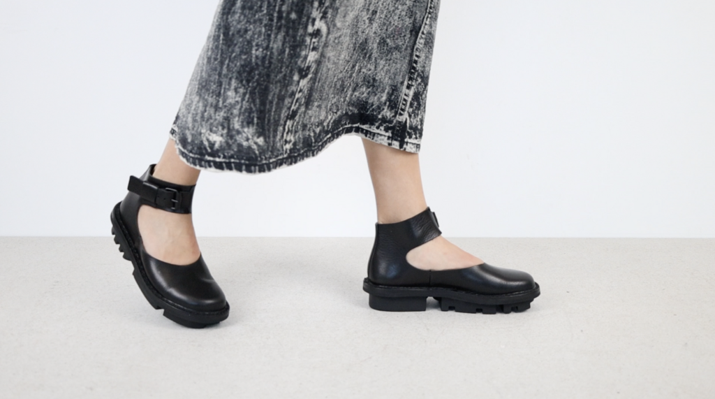 Ballerina boasting a high strap running around the ankle and a leather-covered buckle on the outside.