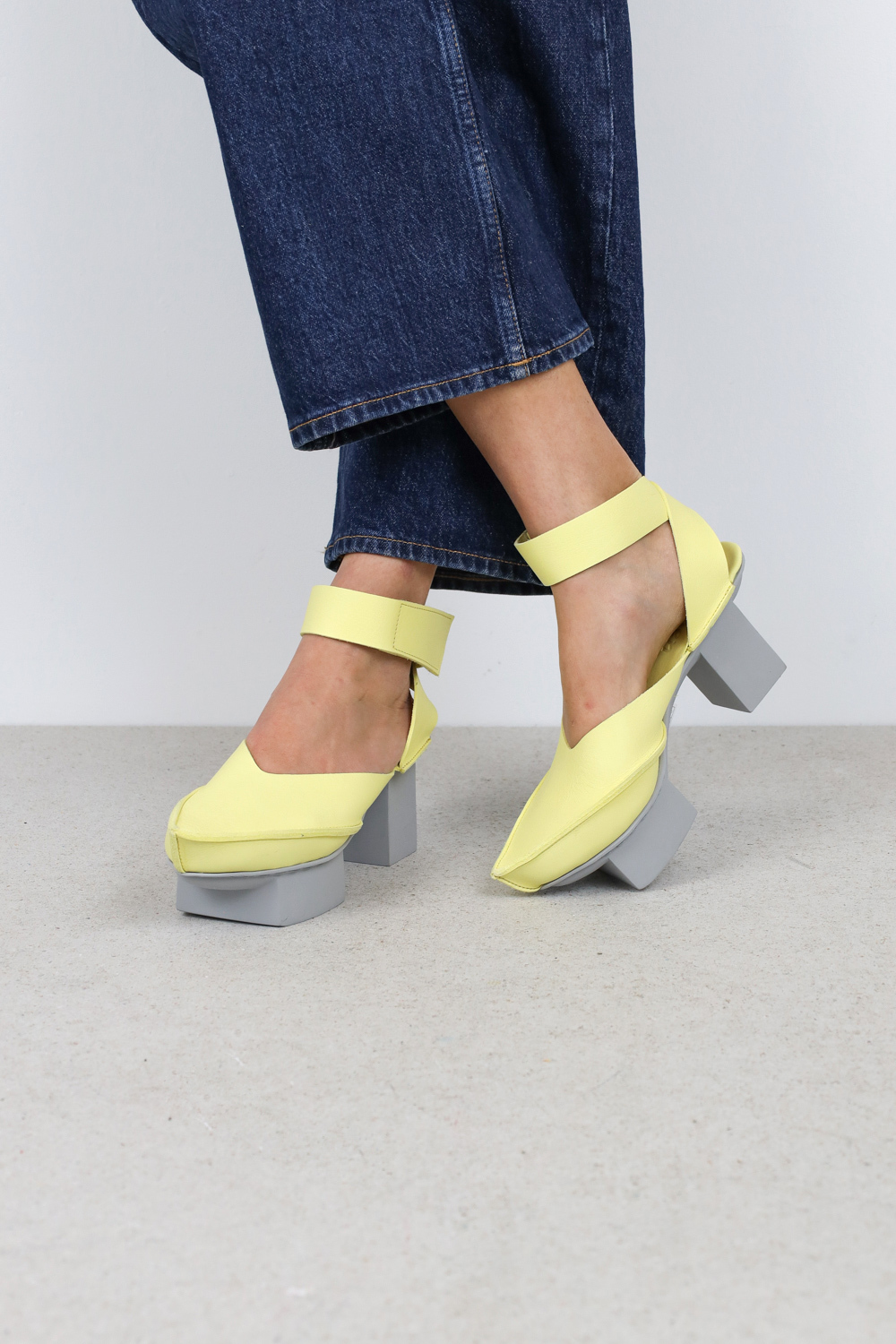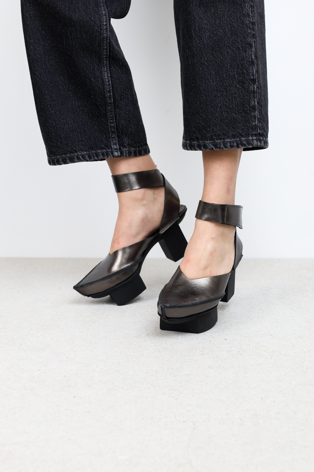 A Gothic-style vamp secures the forefoot, while the ankle straps cross over the heel and are fastened with a hook-and-loop closure.