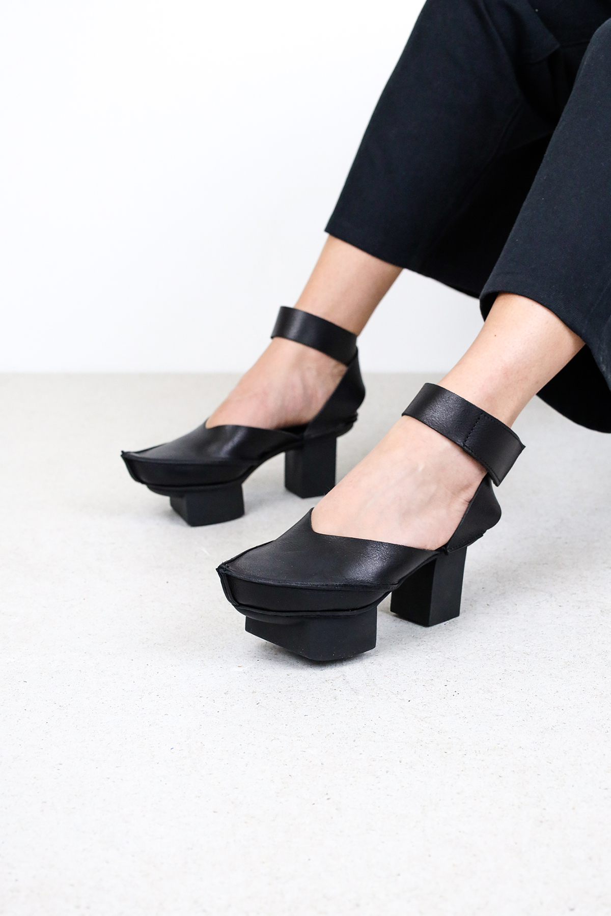 Eine gotische Spitze hält den Vorfuss, während die Fesselriemen über der Ferse gekreuzt und mit einem Klettverschluss geschlossen werden.
