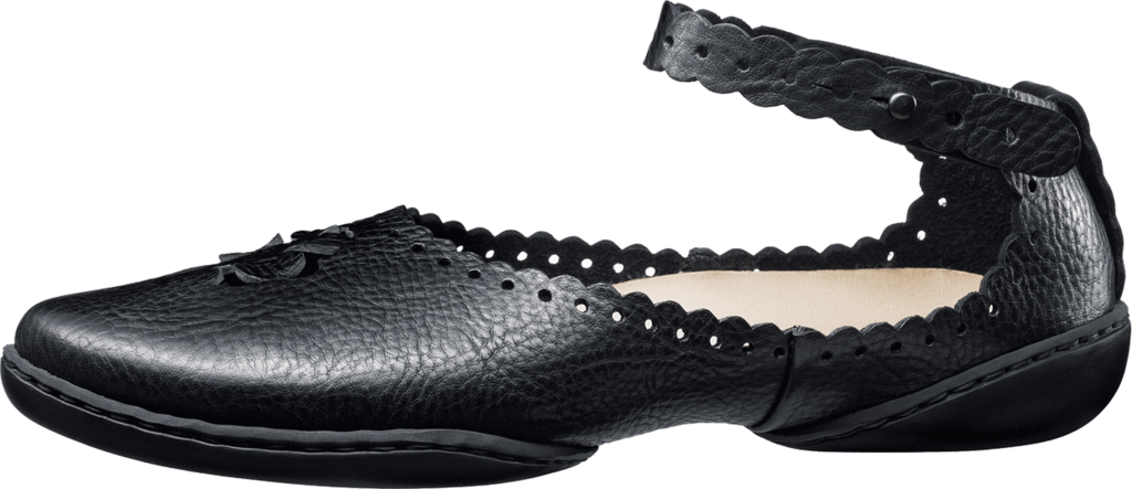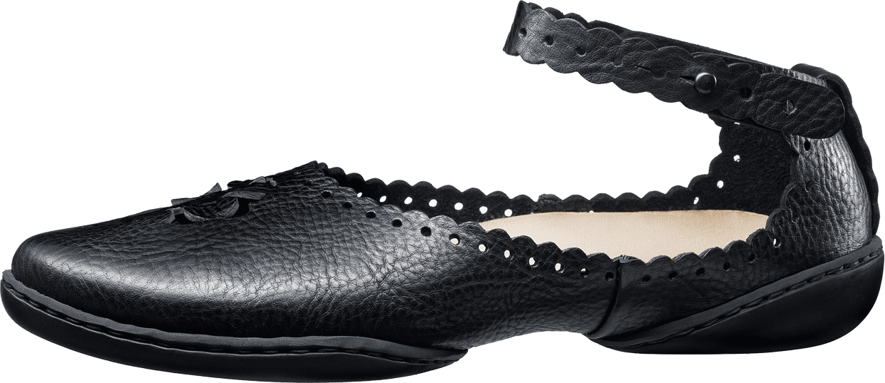 Feminine ballerina with decorative peek-a-boo design along the top line and the ankle strap and a charming decor reminiscent to an »Arabesque« on the vamp.
