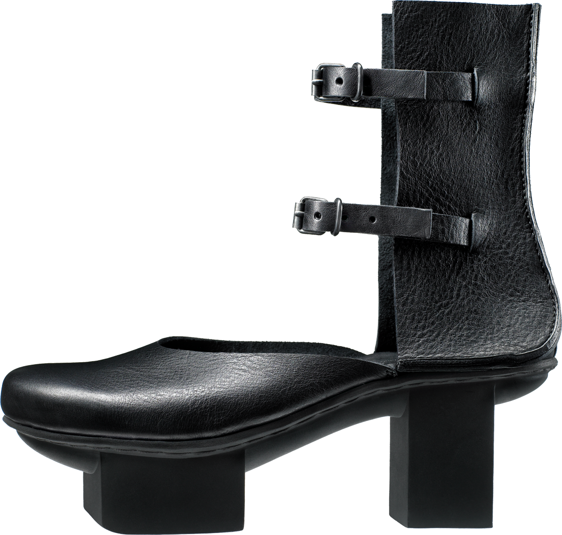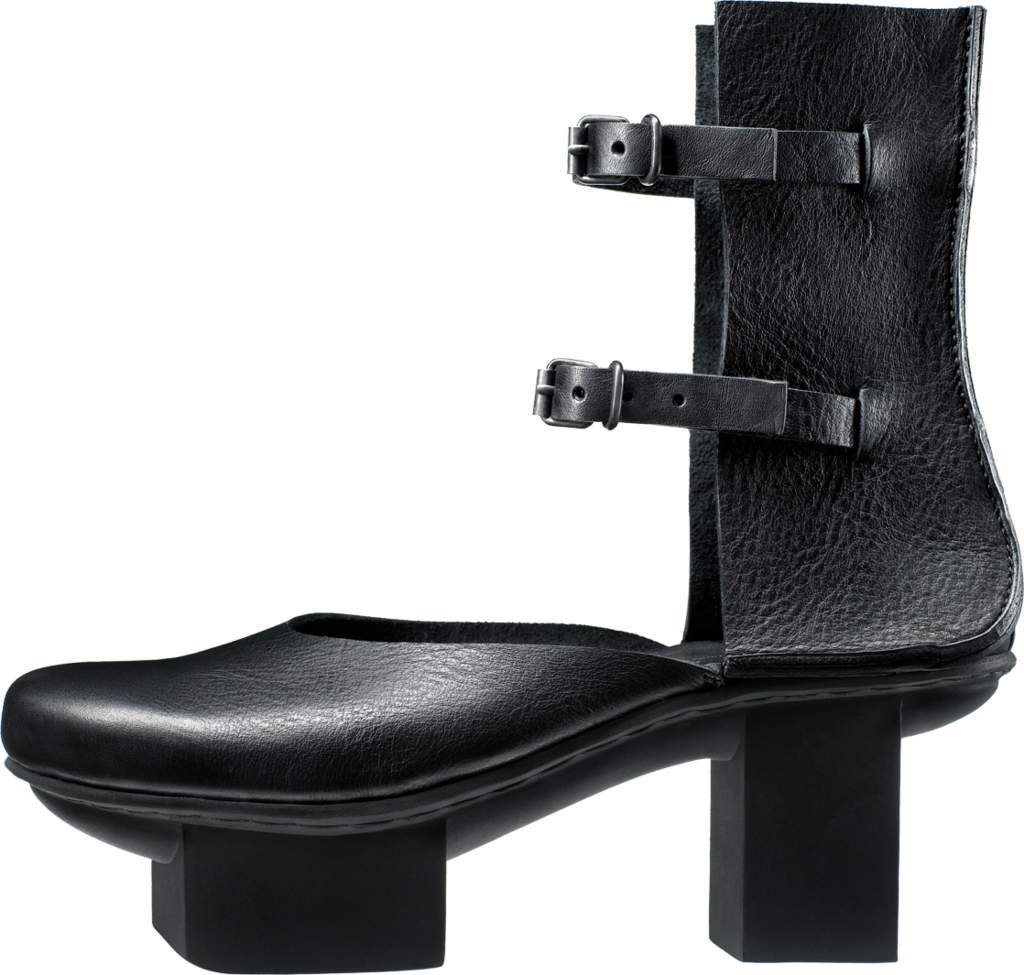 Bootie with wide-open instep and two parallel straps with buckle fastening. The straight lines of the upper continue the shape of the heel visually.