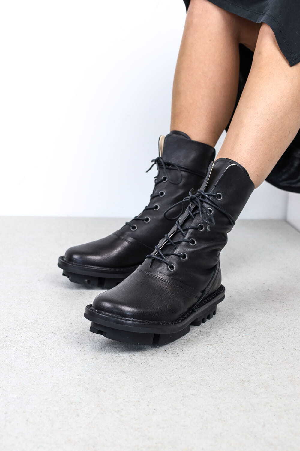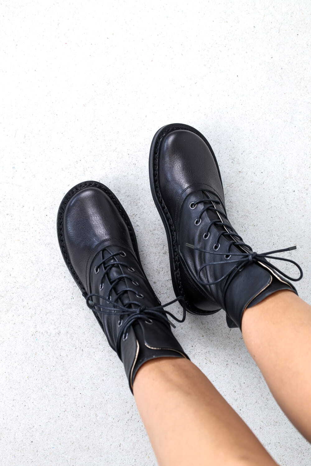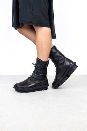 Average is a robust, leather-lined boot with eyelets designed for laces. The superimposed vamp and heel section are highlighted by a decorative seam. Extra-long laces can be casually threaded through the back flap and wound around the ankle.