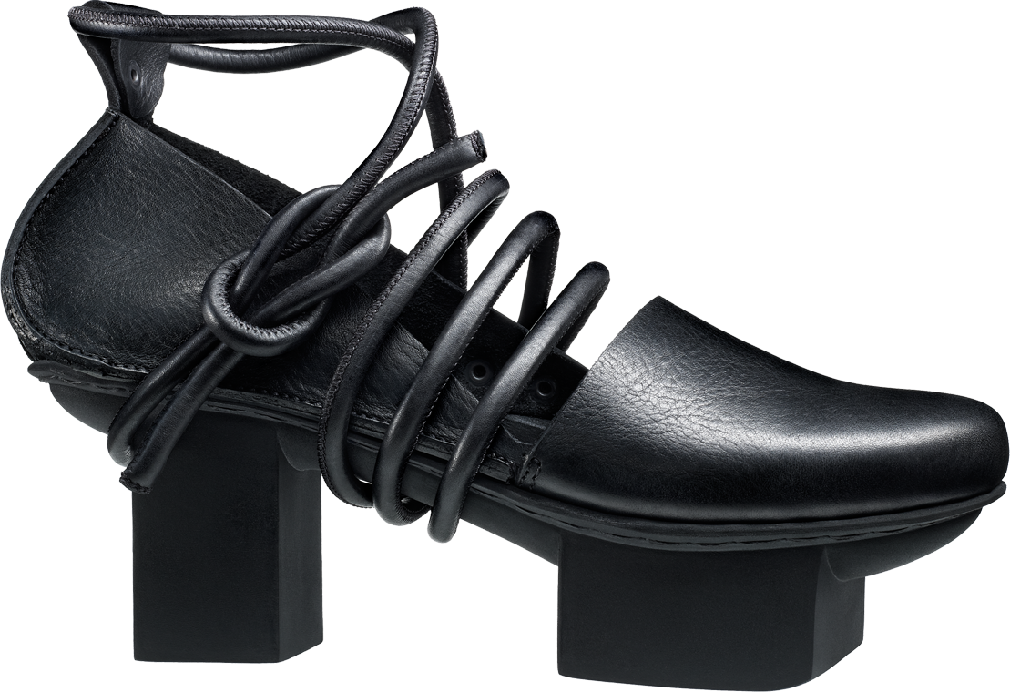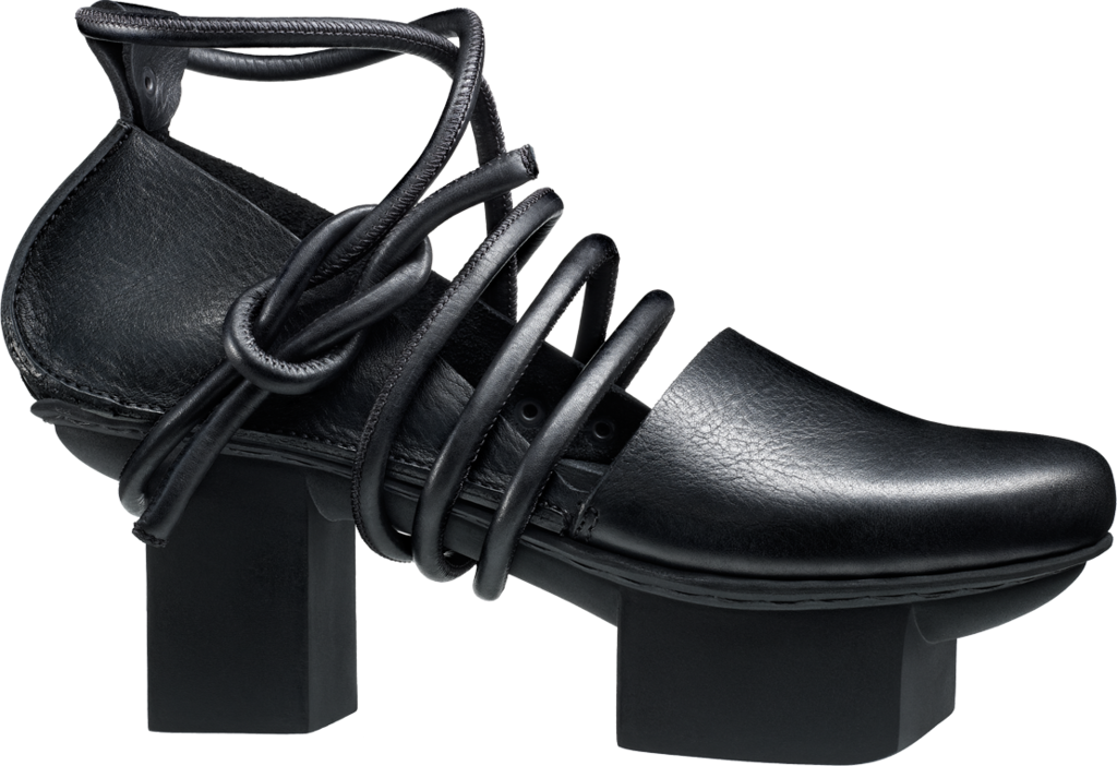 Closed variation to »Ajar«. The exrtra thick leather cord tied around the foot and the ankle is riveted to the inside in such a way as to make this style fully functional despite its unusala appearance.