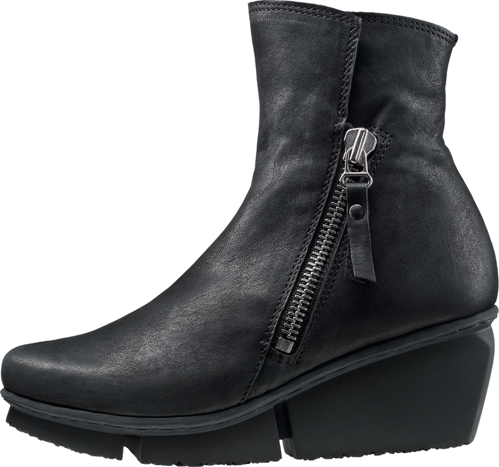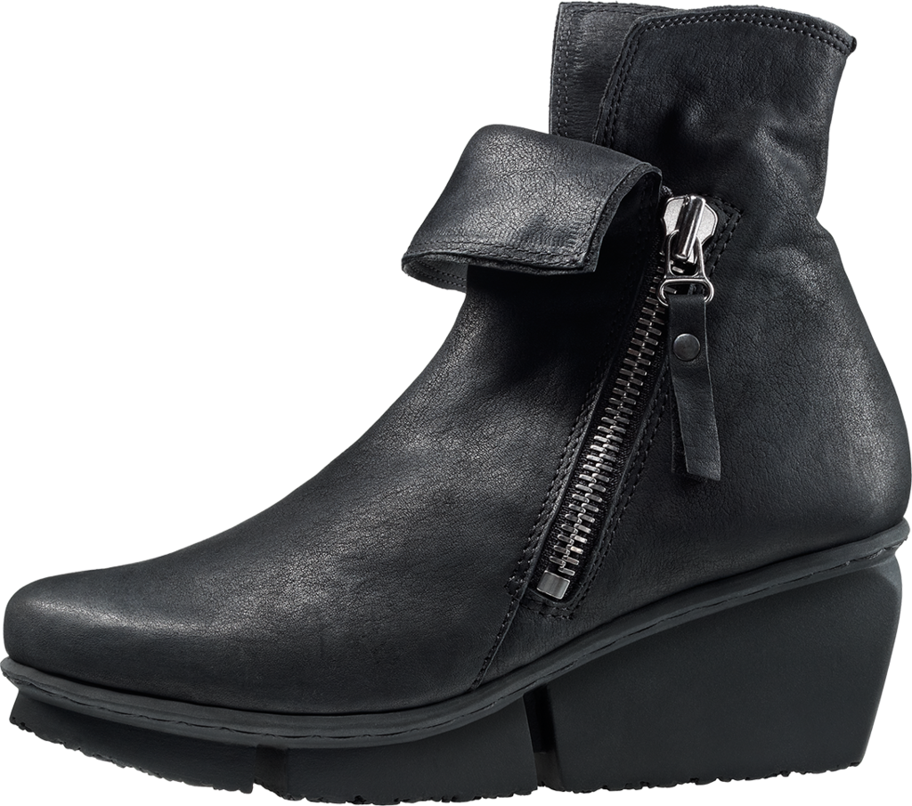 High-cut ankle boot with a wide metal zip on the outside. The top of the shaft can be decoratively turned down.