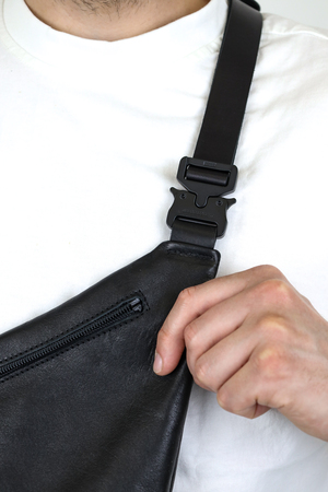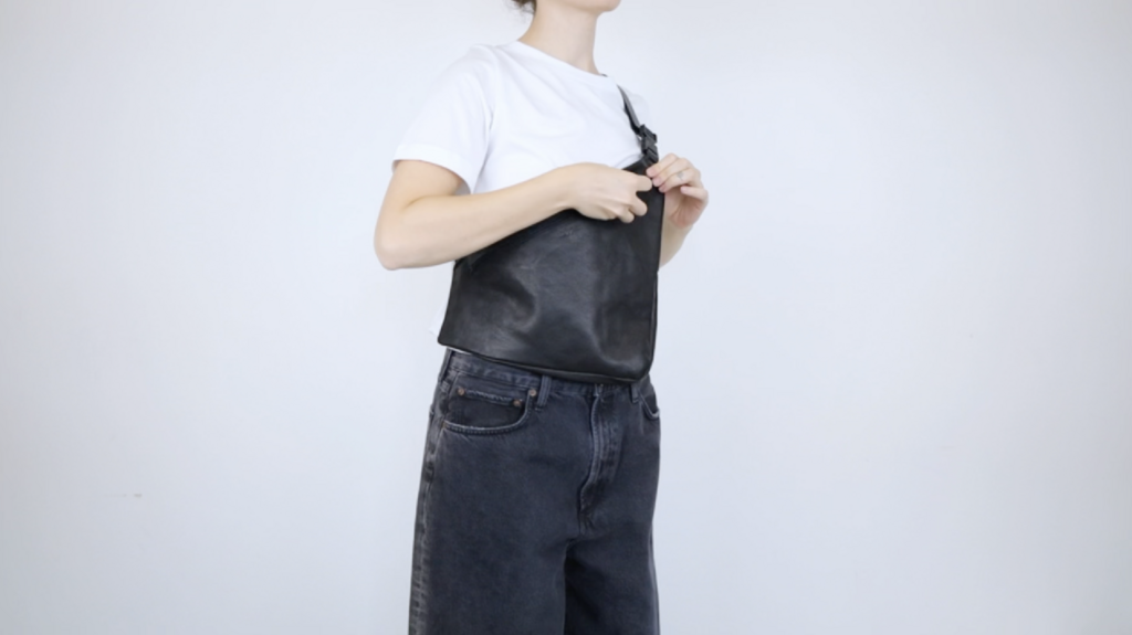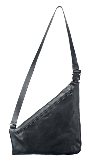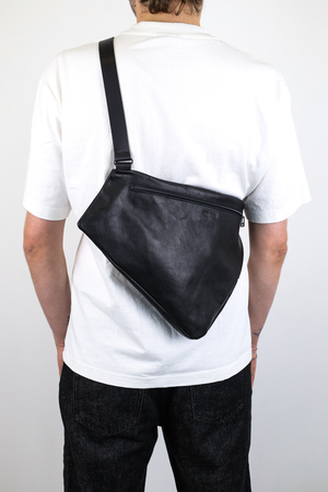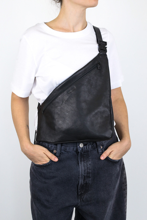 Soft, lightweight sling bag with an asymmetrical silhouette and volume crafted through sophisticated interlocking cuts. Perfect for carrying a book, notebook, or daily essentials.