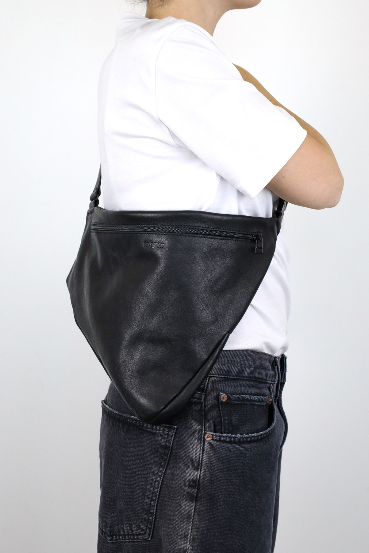 Weiche, leichte Gürteltasche mit asymmetrischer Silhouette und einem durch raffinierte, ineinandergreifende Schnitte geschaffenen Volumen. Perfekt, um ein Buch, ein Notebook oder die wichtigsten Dinge des Alltags am Körper zu halten.