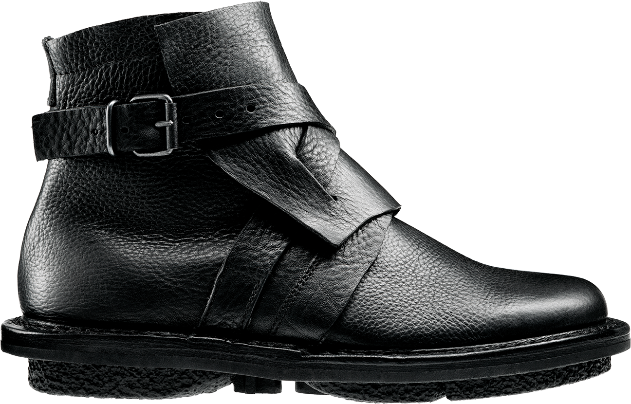 Medieval leather amour gave the idea. The flap on the instep is blocked to form its curved shape and hold in place by a leather strap. Every piece of leather behaves different when blocked and thus can vary in size.