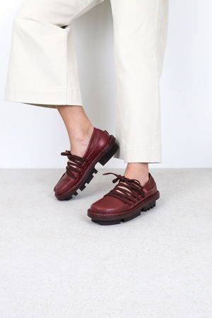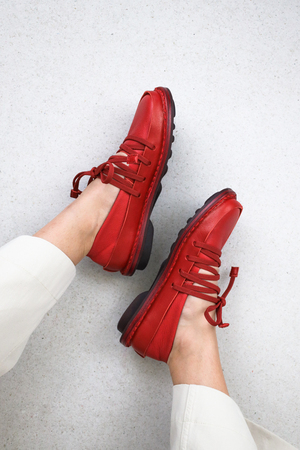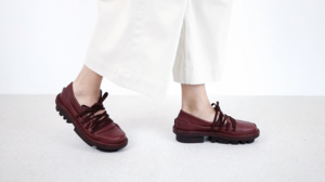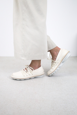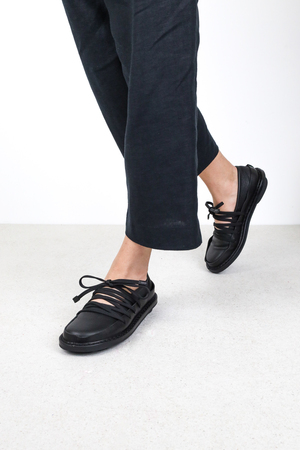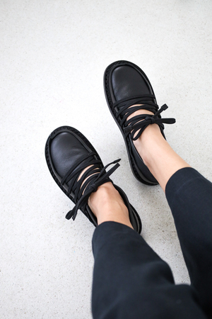 Ballet flat made of soft leather with a firm leather trim running all around. The elastic drawstring lacing creates a geometric structure that flexibly secures the foot.