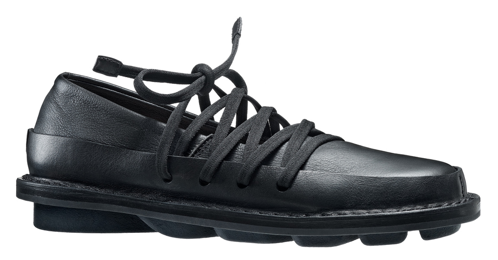 Ballerina aus weichem Leder mit einem umlaufendem festen Lederrand. Durch die Gummizugschnürung entsteht eine geometrische Einheit, die den Fuß flexibel festhält.