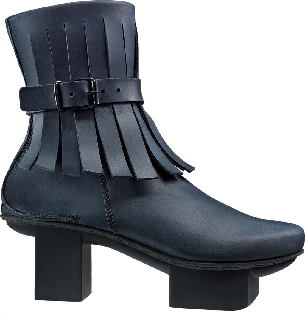 Biker-boot-style ankle boot with a tasselled fringe and a zip on the inside. A buckle strap around the ankle holds the tassels in place and provides additional support.