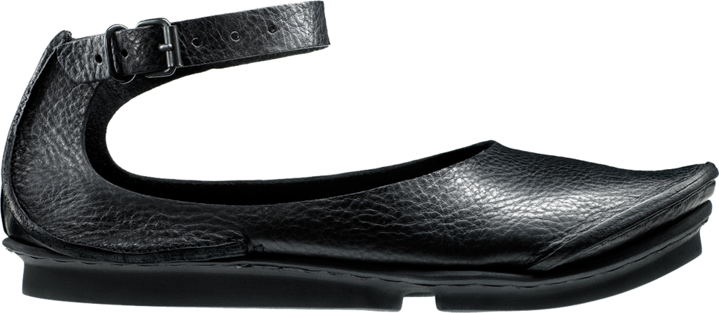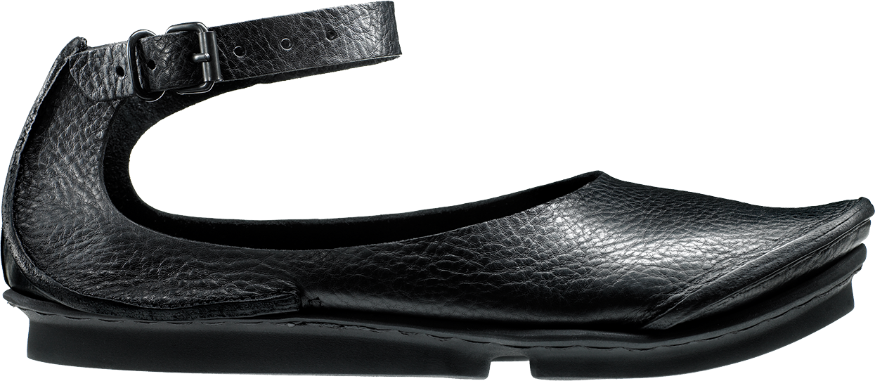 Very plain model with no décor, featuring a semi-circular raw seam around the tip and a narrow ankle strap with buckle fastening.
