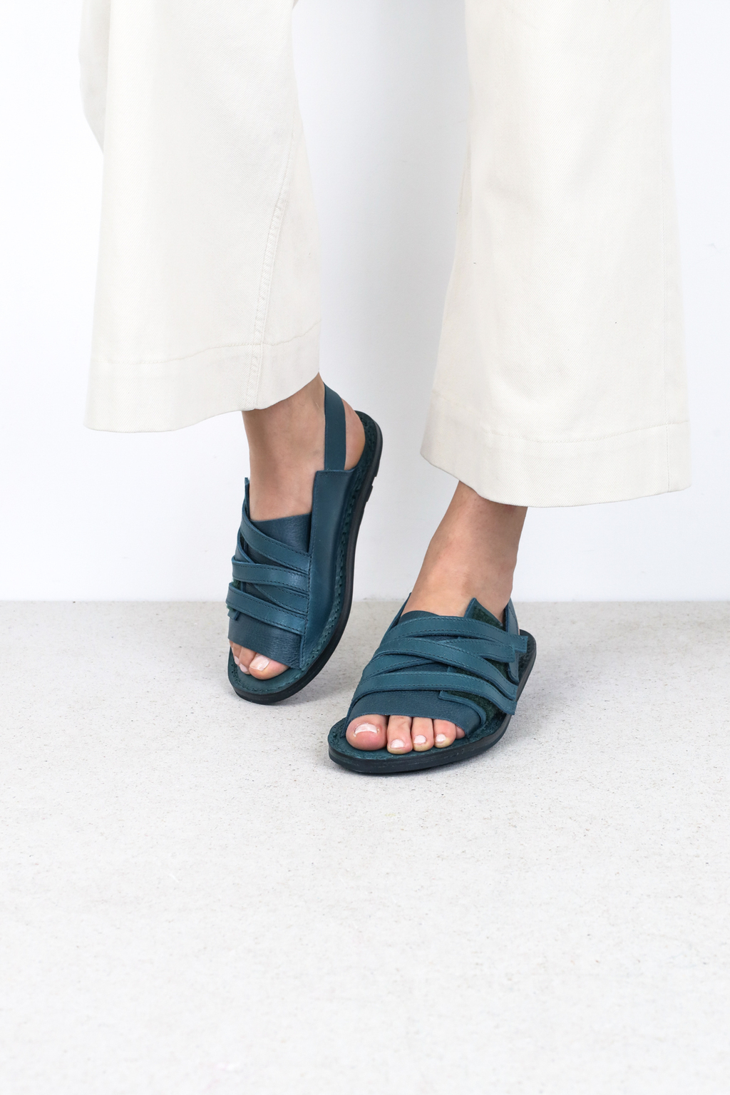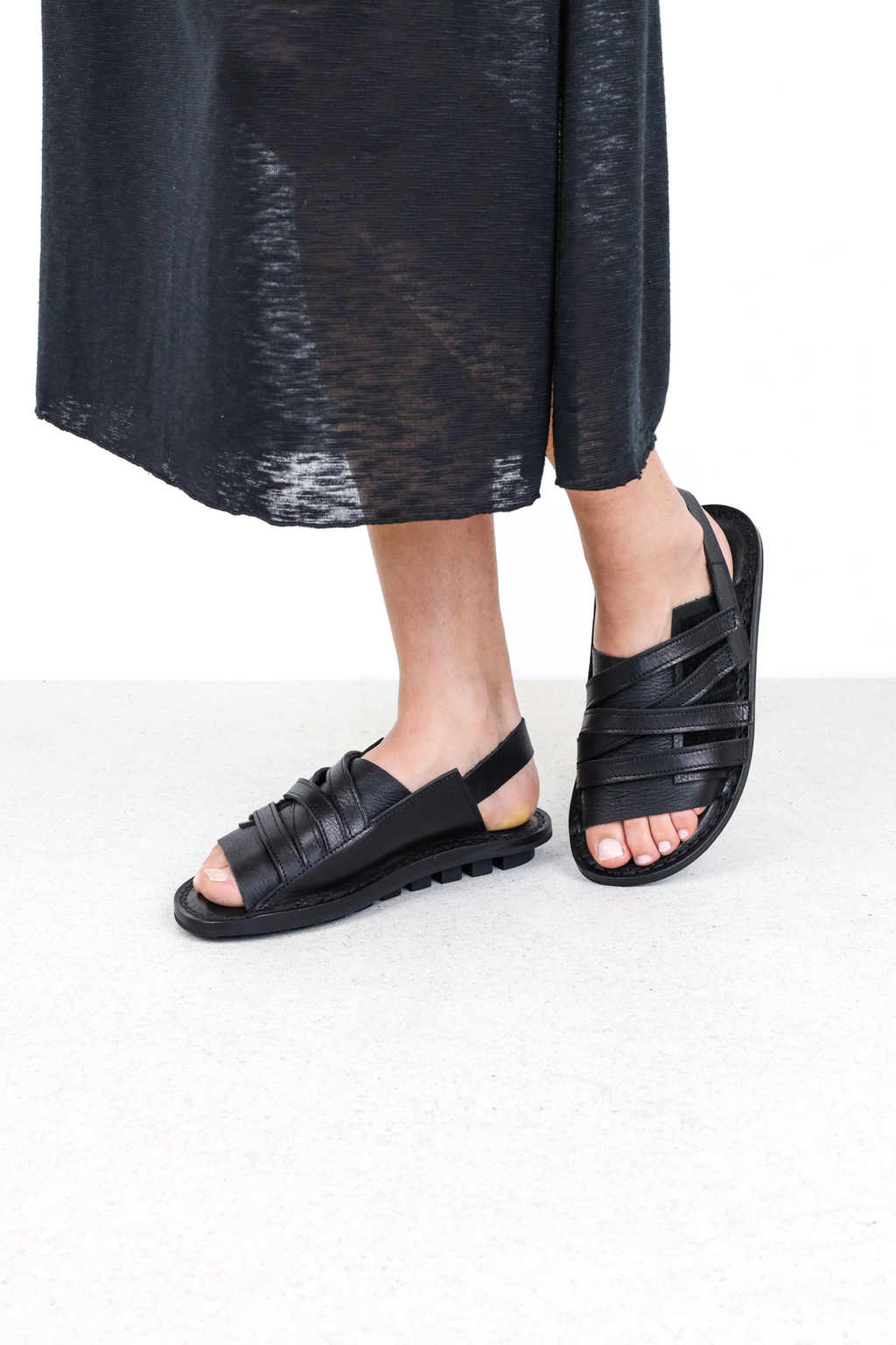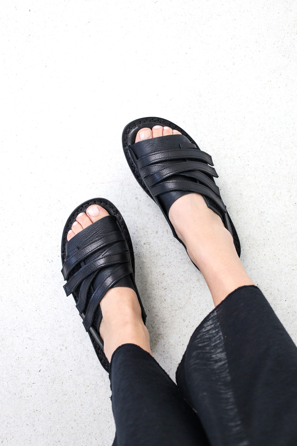 The unisex sandal with soft leather across the instep and a heel strap is secured by a hook-and-loop surface that allows multiple straps to be attached in any desired position.