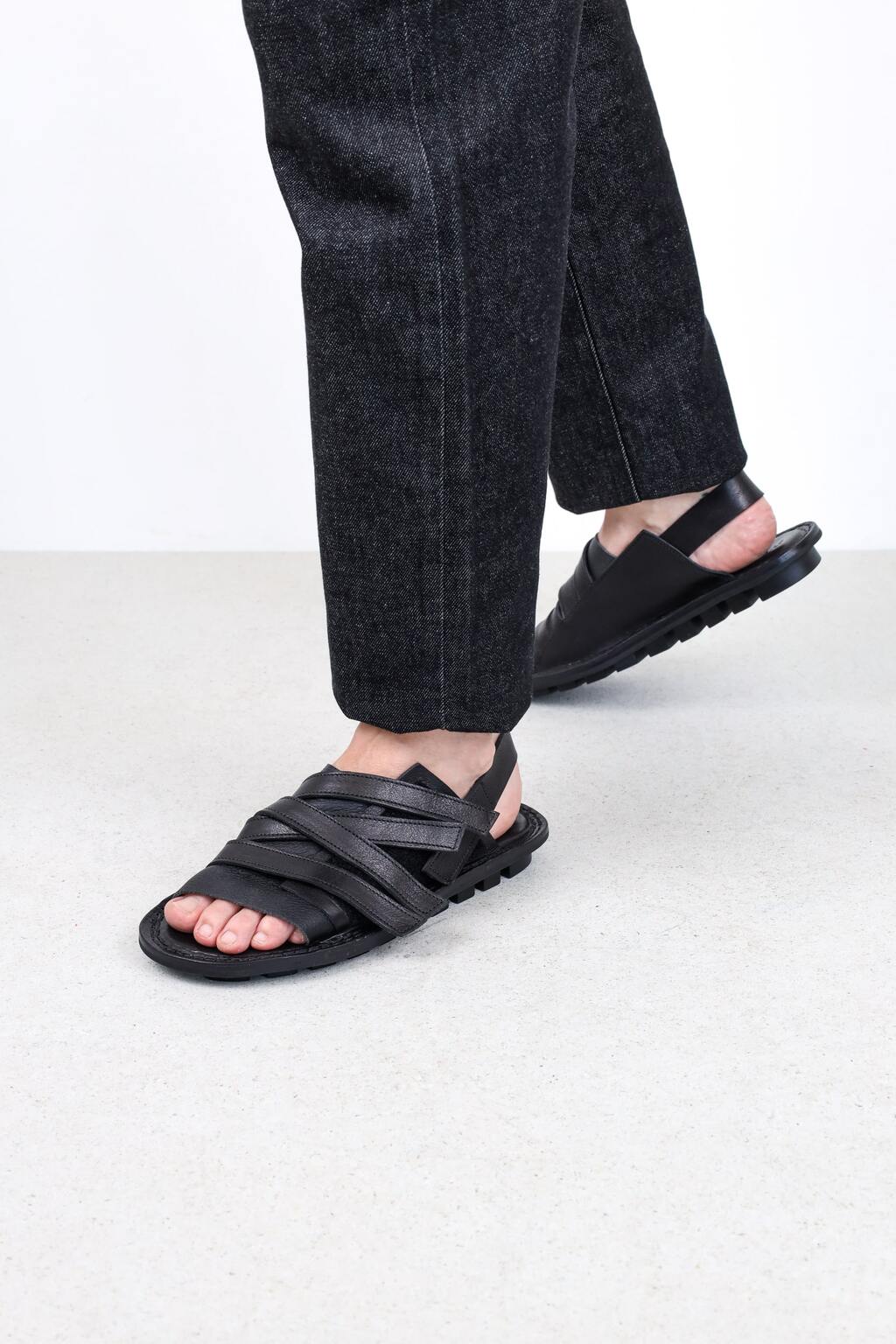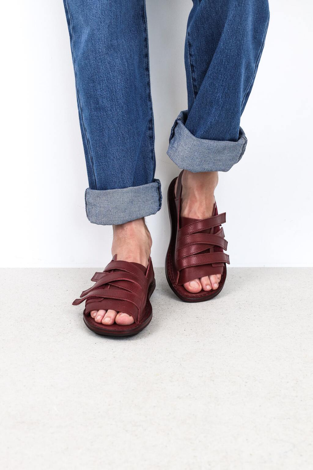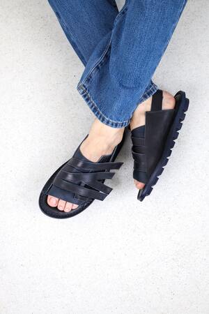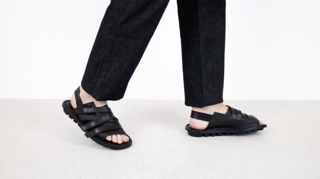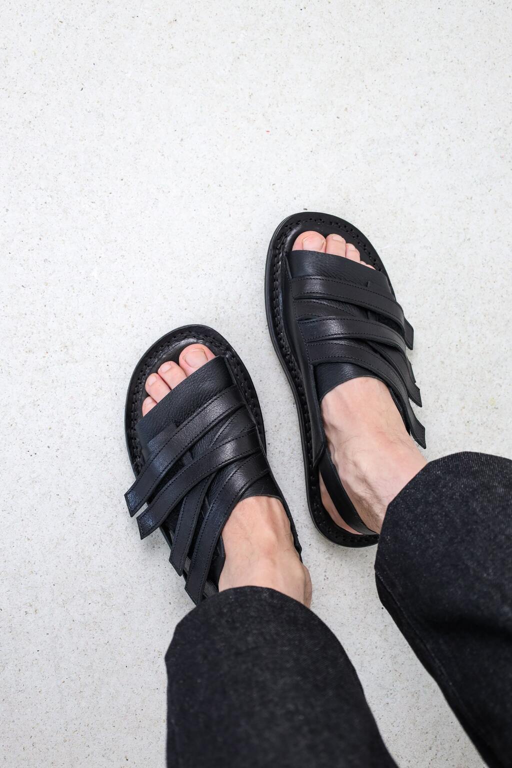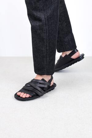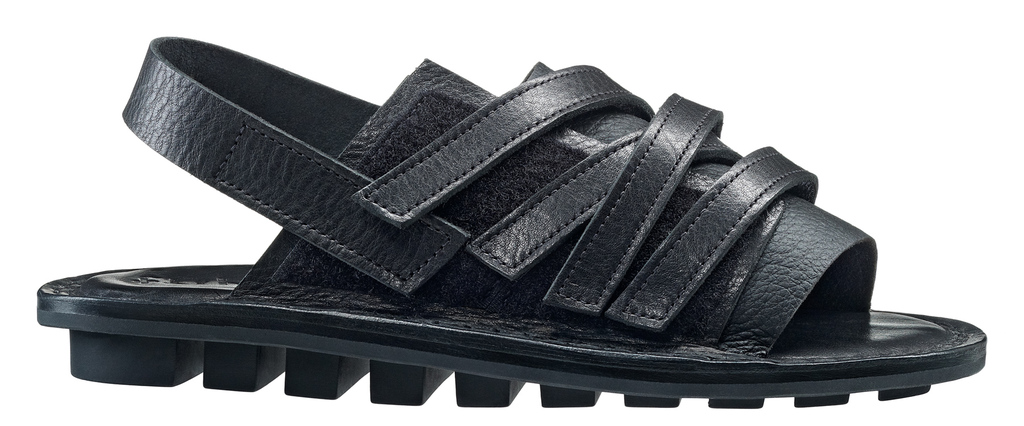 The unisex sandal with soft leather across the instep and a heel strap is secured by a hook-and-loop surface that allows multiple straps to be attached in any desired position.