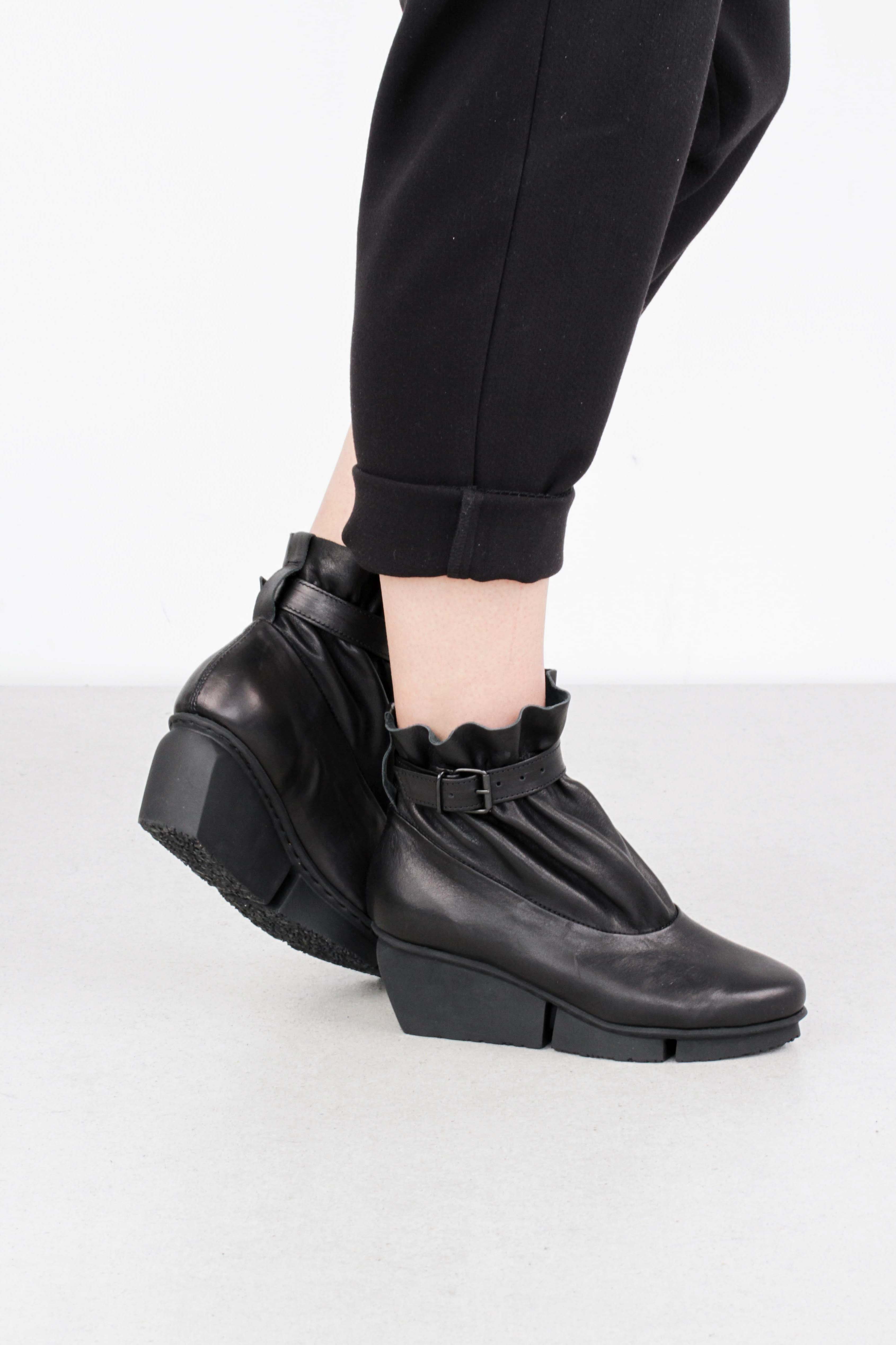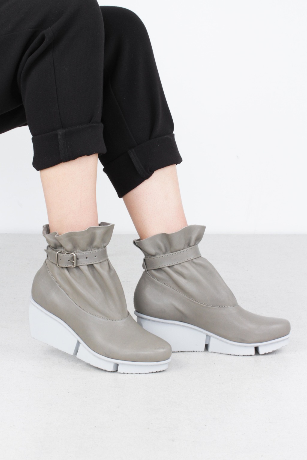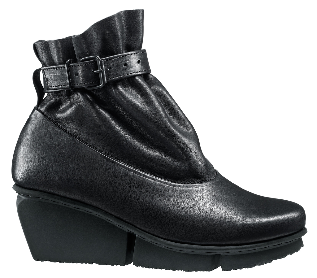Feminine ankle boot with ruched upper and functional heel strap closed with a buckle. An integrated elastic section provides excellent support.