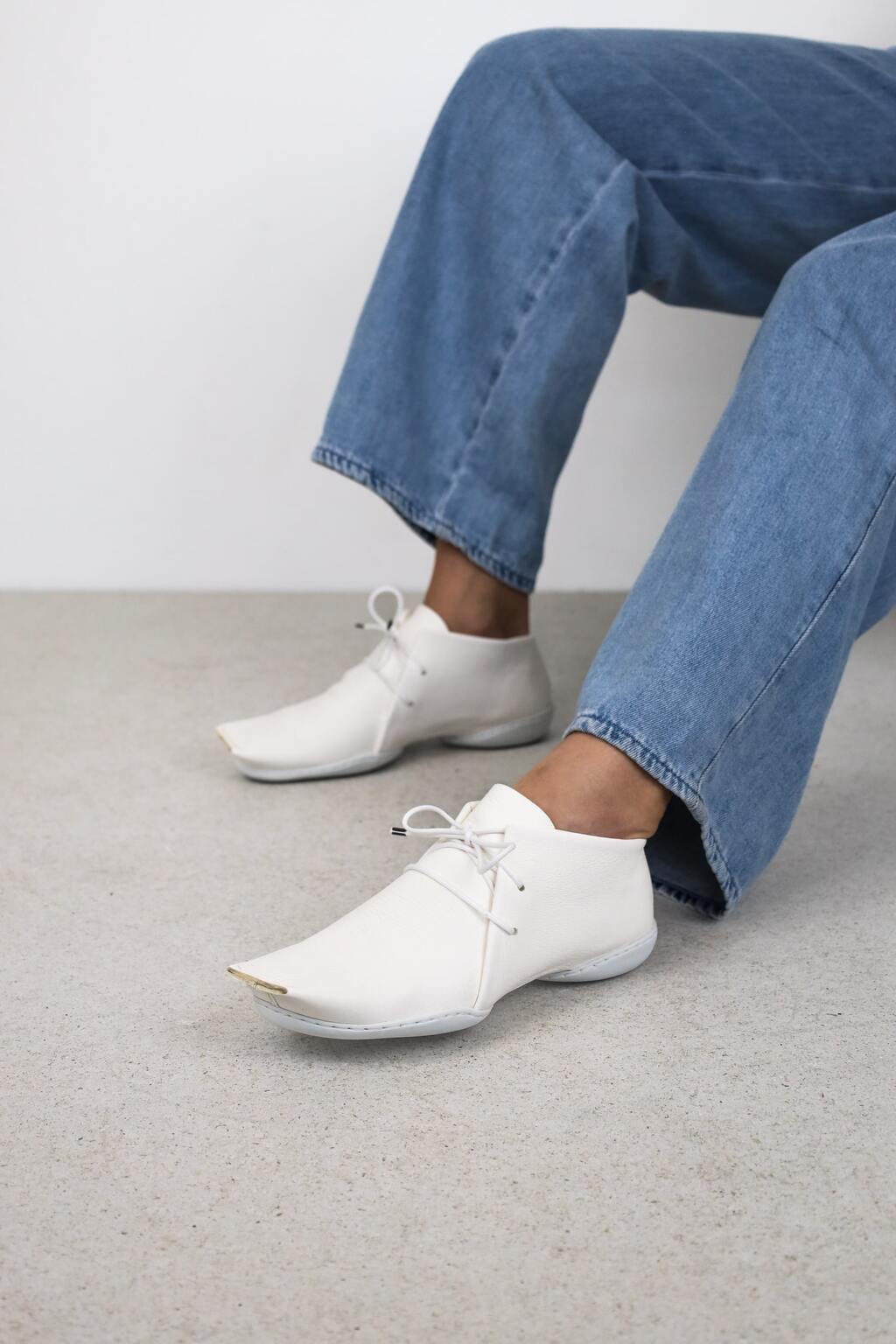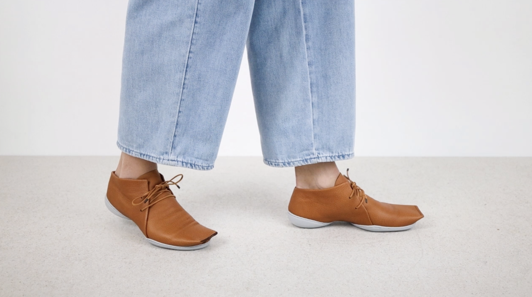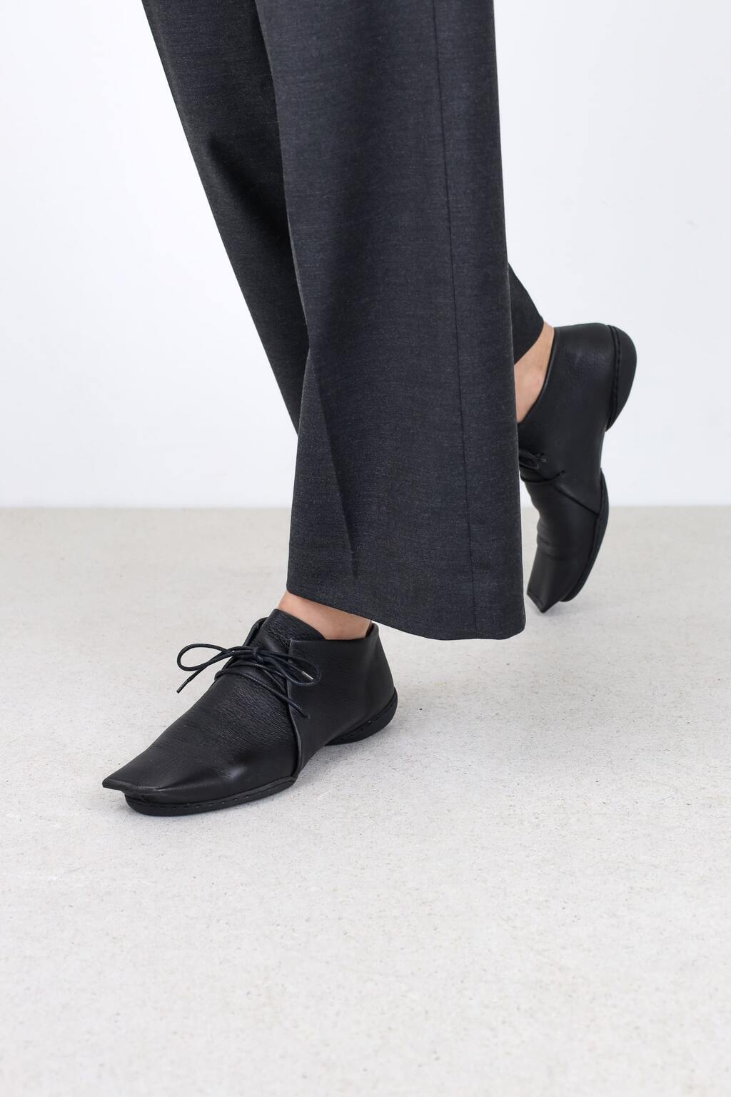 Gerade, geometrische Formen und eine wie abgeschnitten wirkende Karreespitze kontrastieren bei diesem Schnürschuh mit dem weichen Leder.