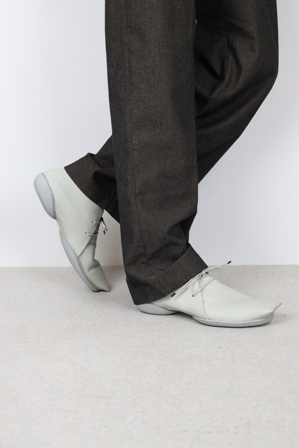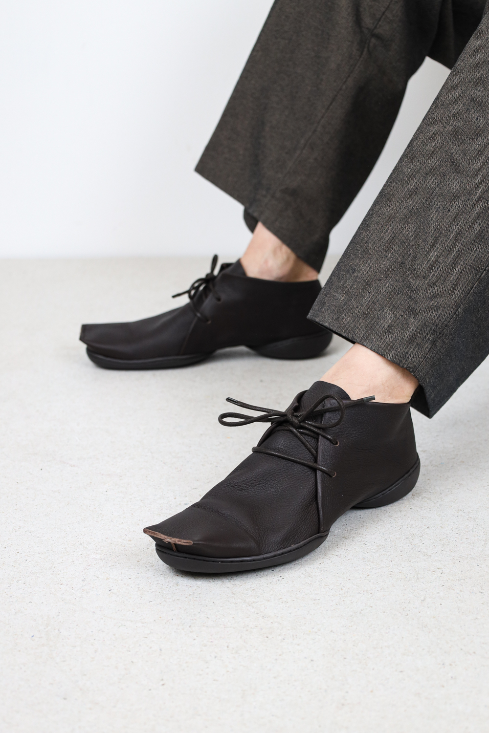 Straight, geometric shapes and a seemingly truncated square toe contrast with the soft leather in this lace-up shoe.