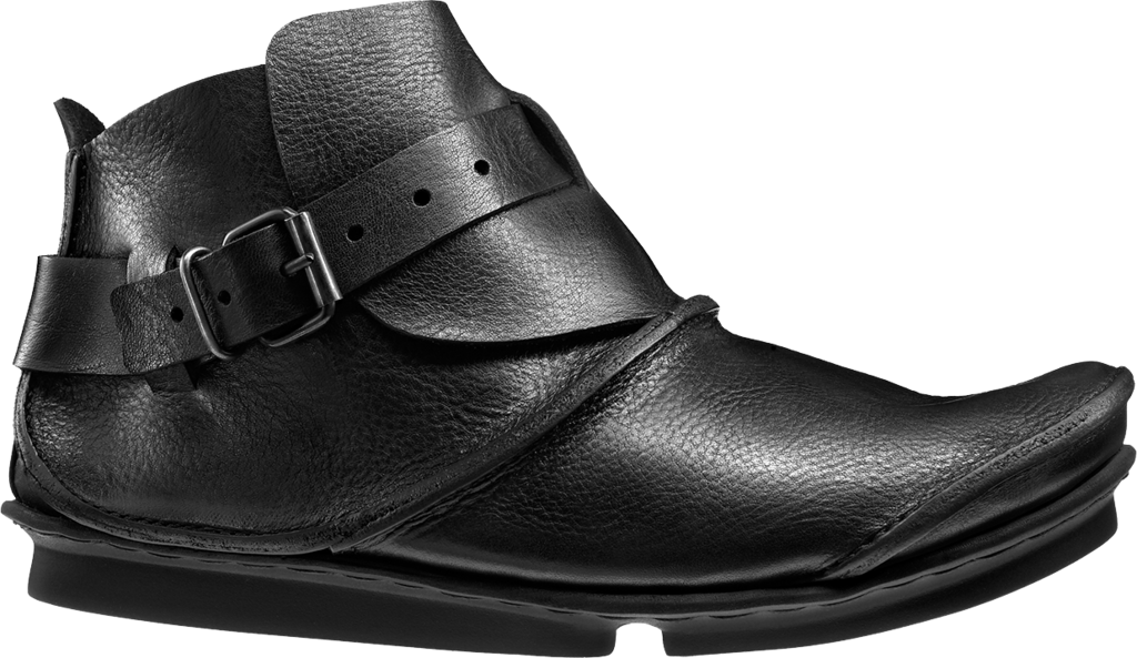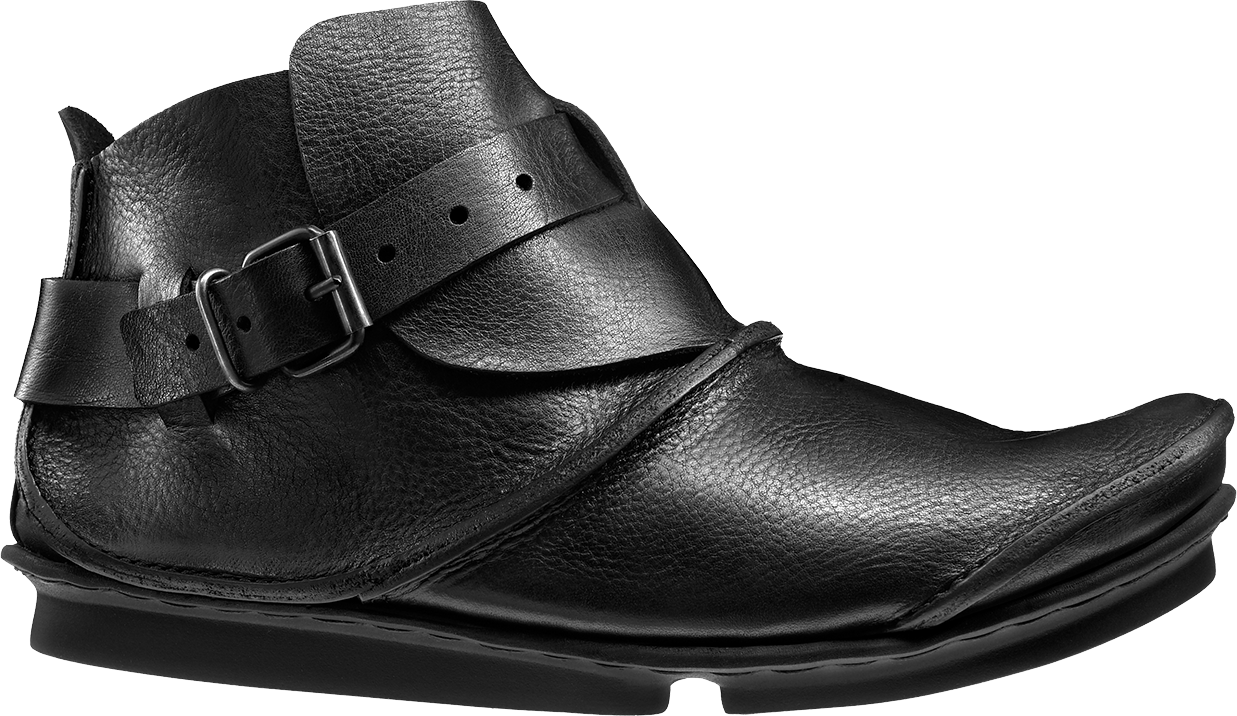 The flap overlaps at the instep and is fixed around the ankle by a broad strap, recalling medieval armour.