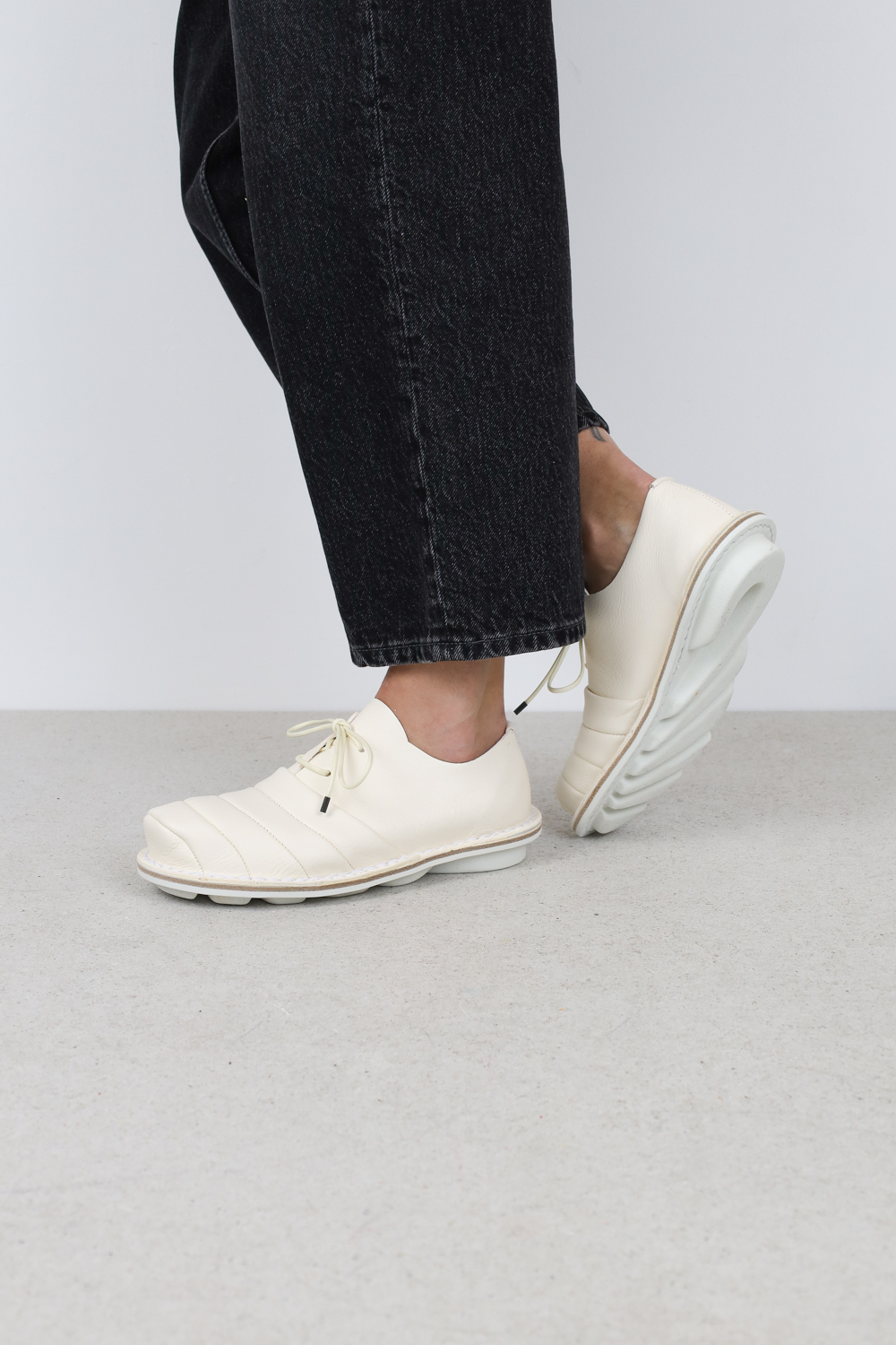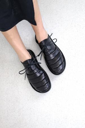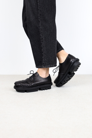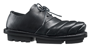 The finely crafted, flowing exaggeration of the toe cap gives this unisex lace-up shoe a distinctive silhouette.