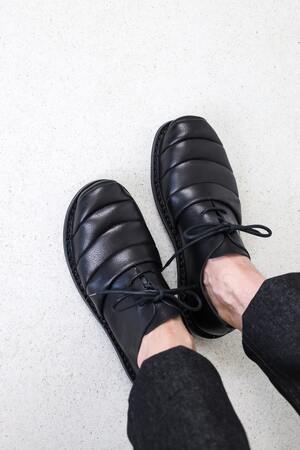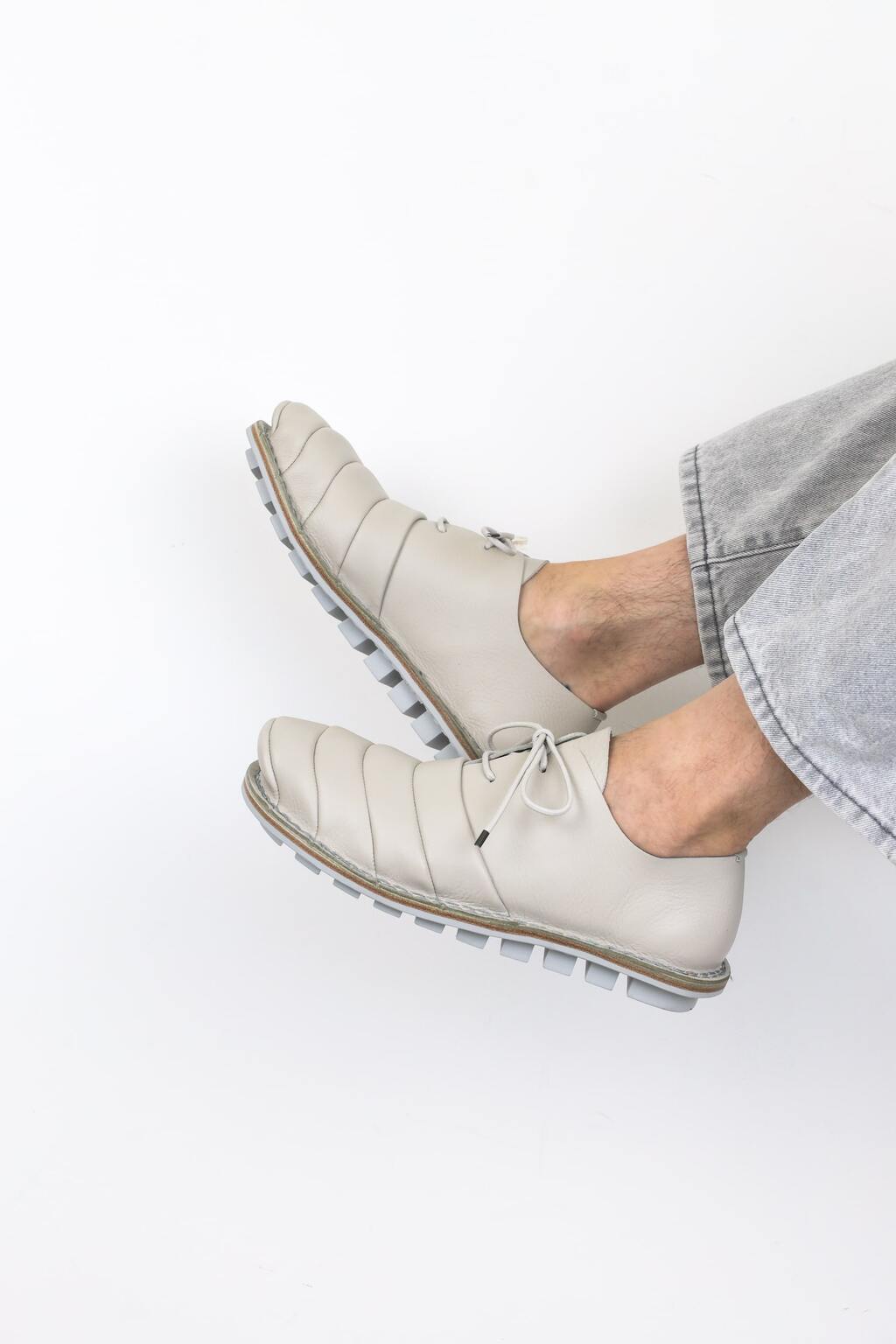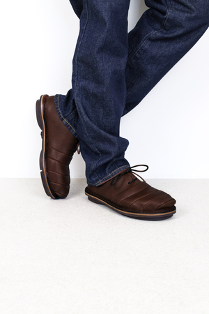 The finely crafted, flowing exaggeration of the toe cap gives this unisex lace-up shoe a distinctive silhouette.