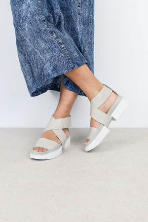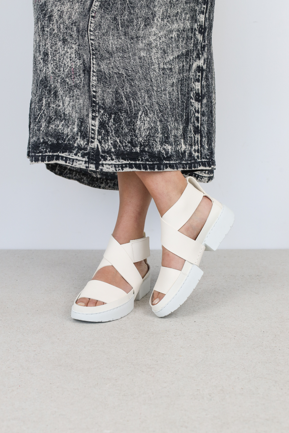Straightforward graphic sandal with a leather rim running along the sole, a wide strap over the toes and a Velcro fastening strap running around the sole and the ankles.