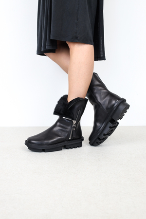 Unisex ankle boot with exterior metal zip fastening. Thanks to the large underlay and leather lining, the upper can be turned decoratively inside out at the top.