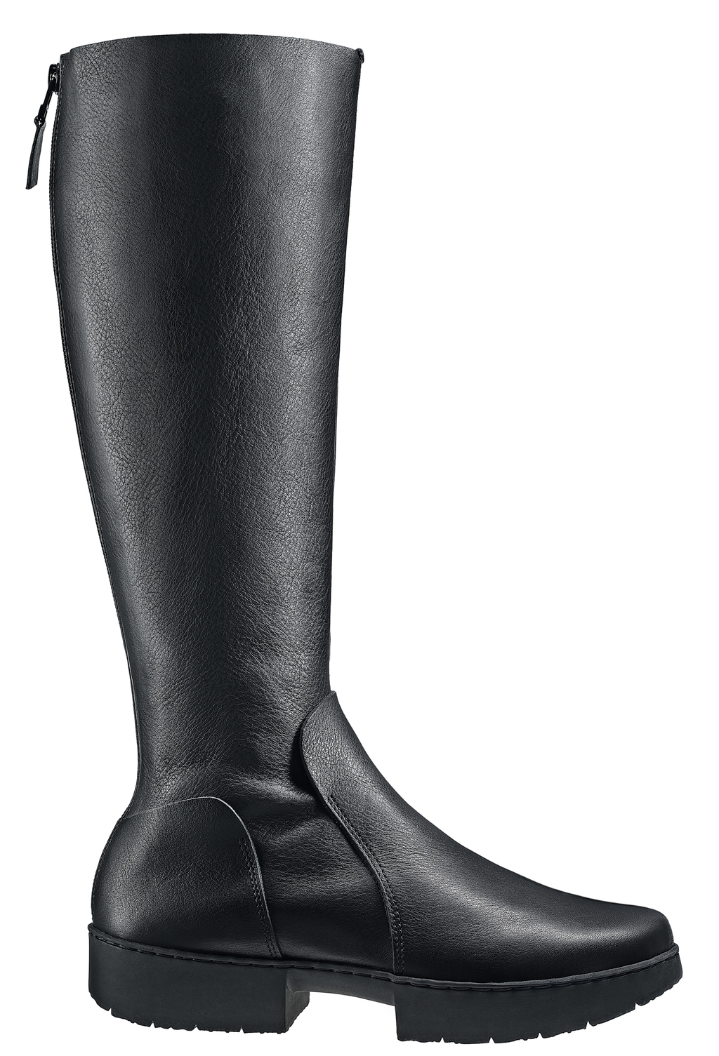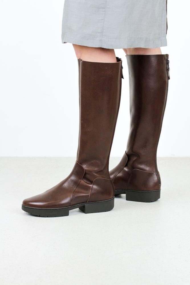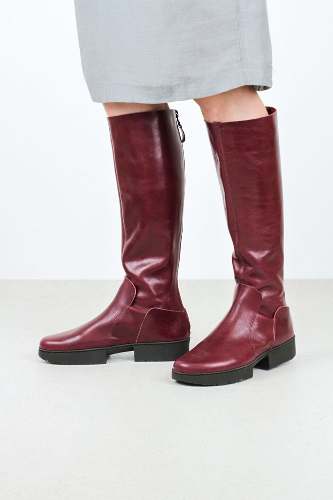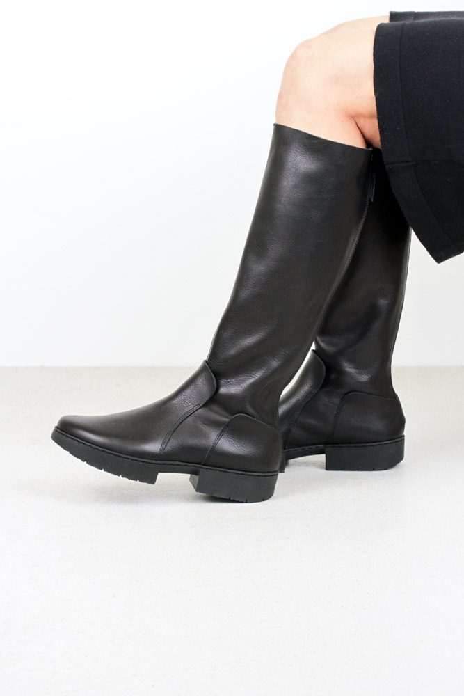 This sleek knee-high boot is finished with a full-length zipper closure at the back. The incompletely-sewn upper layers create a mysterious new space, piquing the curiosity of the viewer.