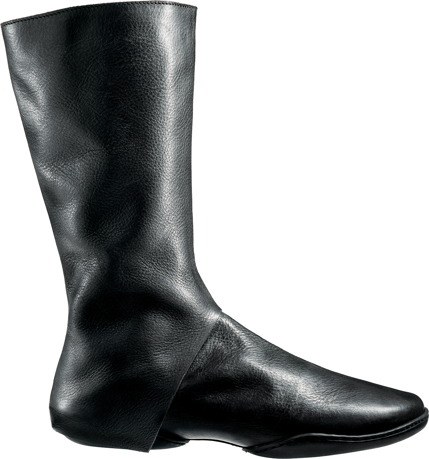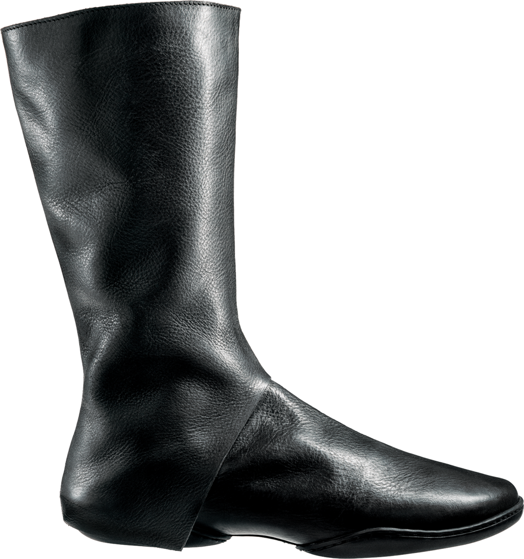 The rear part of the upper is extended to the bottom line and fixed only to the lining. It moves freely and appears so almost like a kinetic sculpture. The bottom edge will fray with wear.