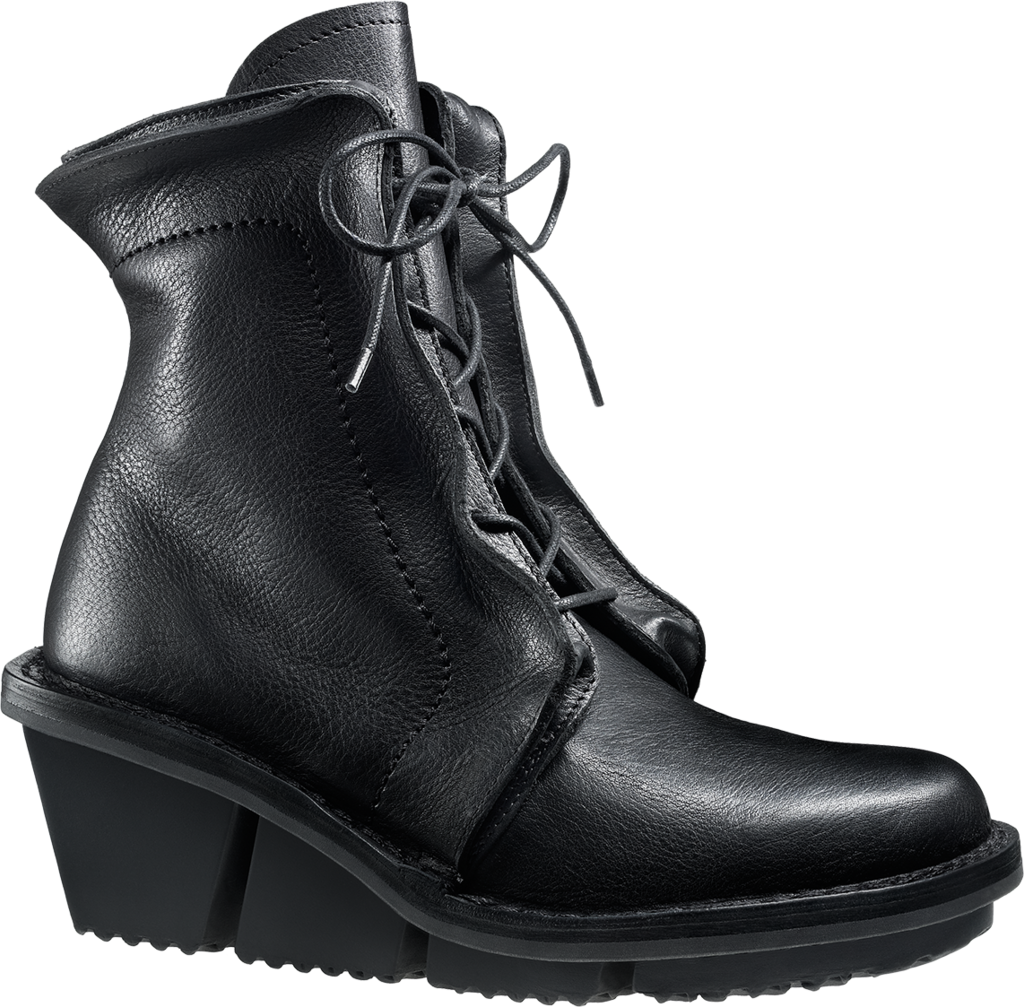 Lace-up ankle boot with impressive plasticity whose lacing is hidden underneath the voluminously doubled edges.