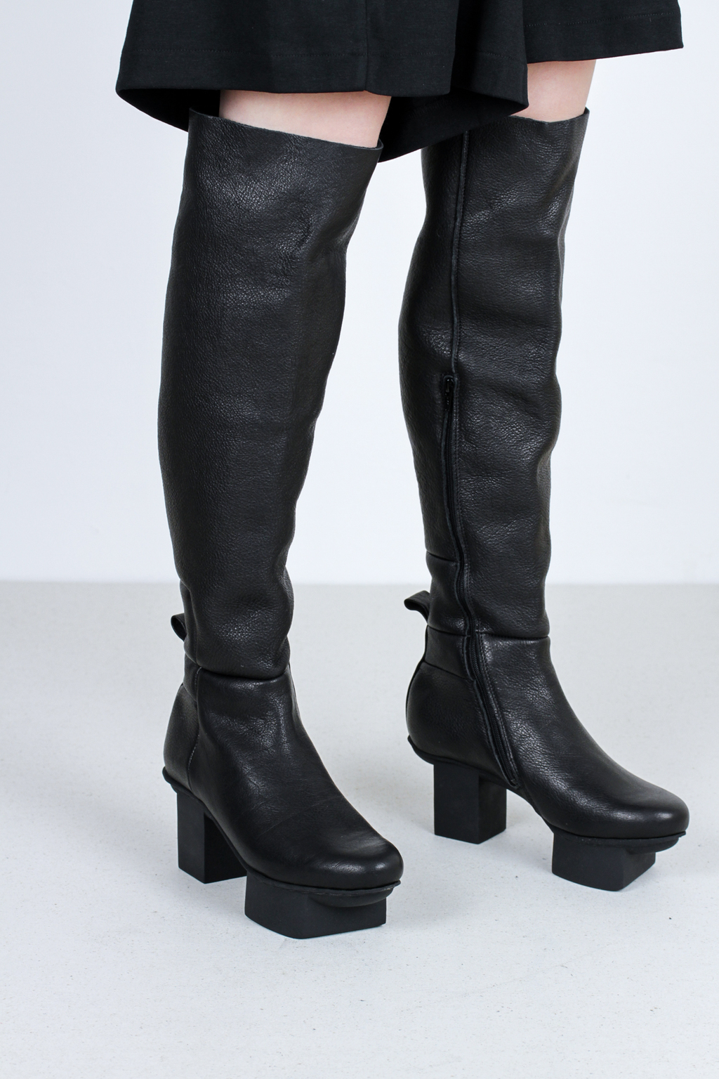 Over-the-knee version of »Pixel« that is constructed from rectangular turned-and-stitched segments and features a zip on the inside. The soft shaft falls against the wearer’s leg with gentle creases, with the upper section lined with a natural wool fleece and the lower part with lining leather. In addition to the increased plasticity, the fleece offers additional thermal insulation.