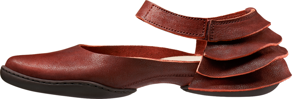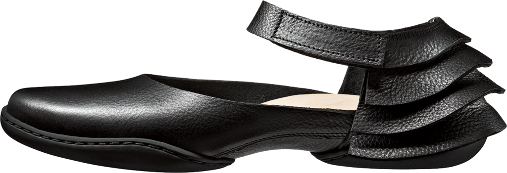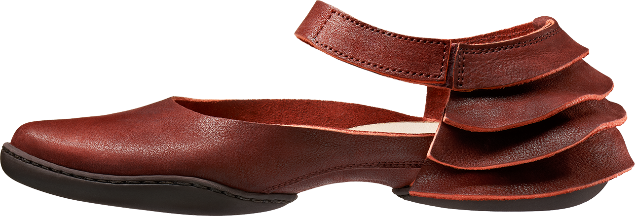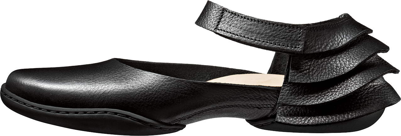 Ballerina with narrow ankle strap. The multiple layers at the heel part are space-capturing like a flounce skirt.