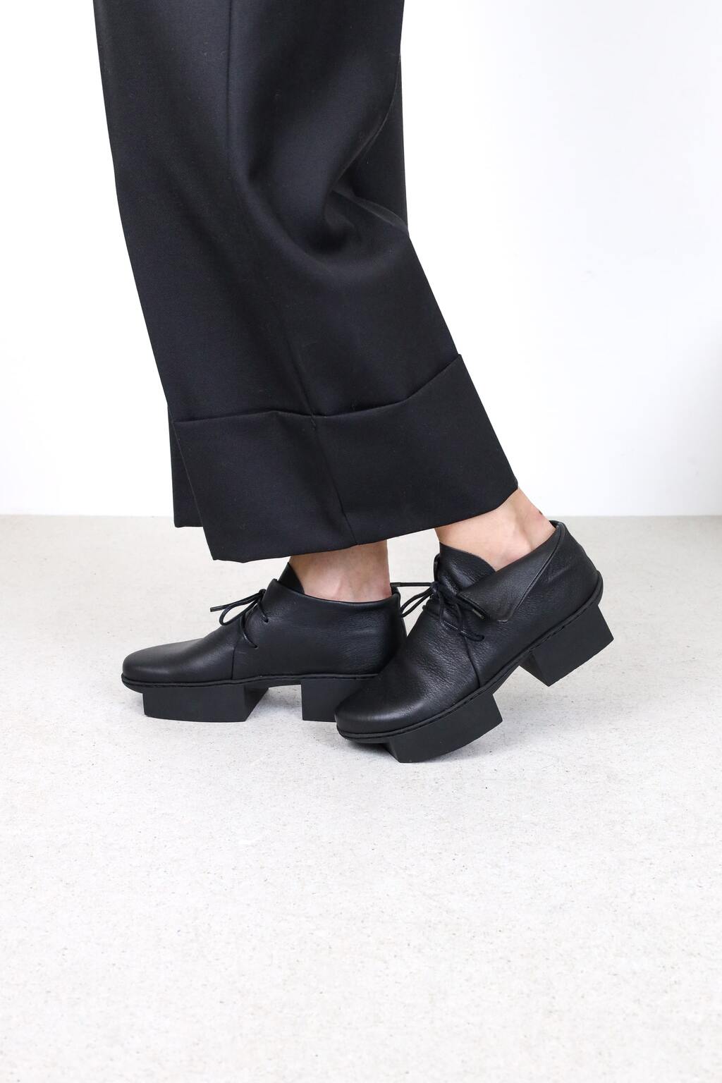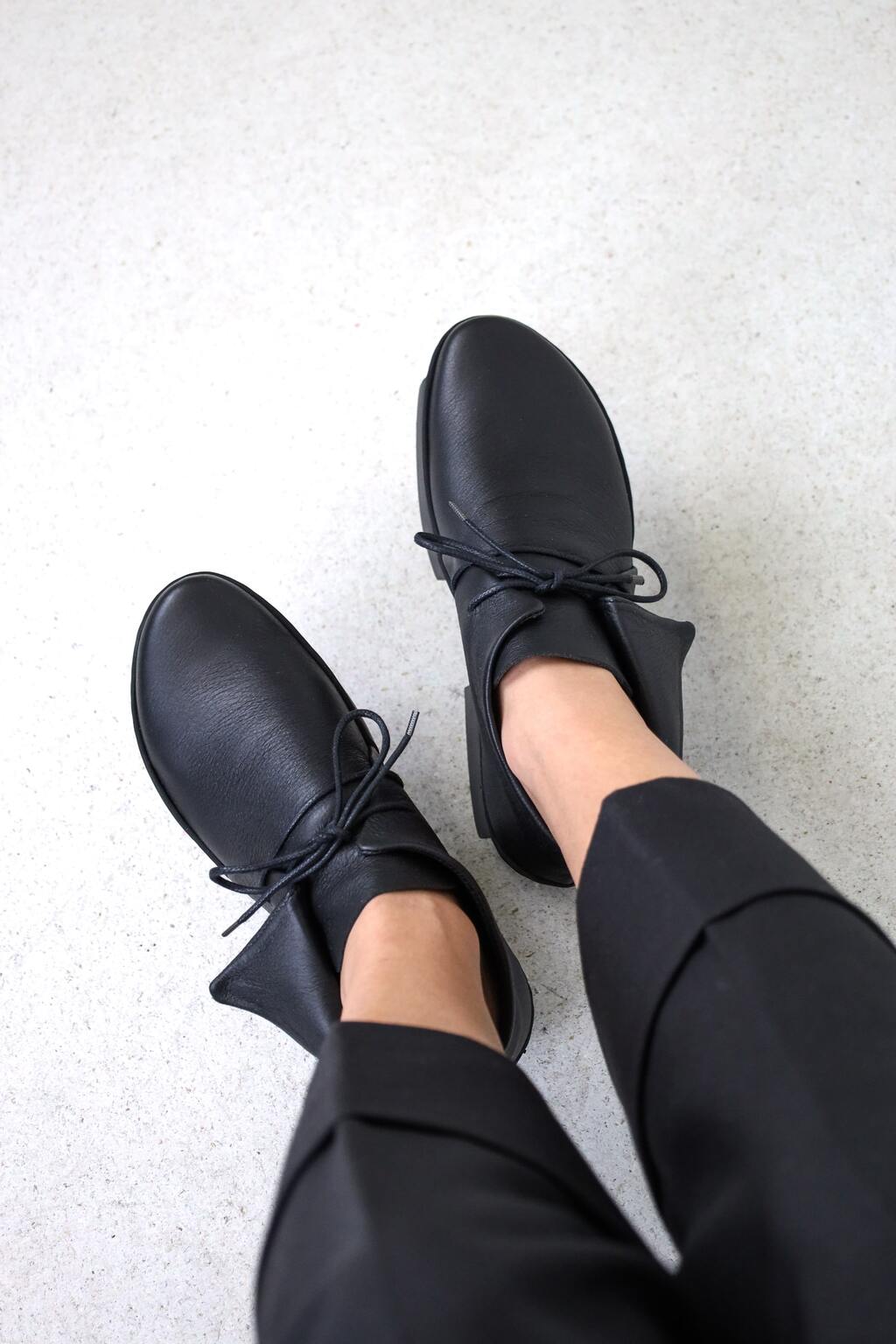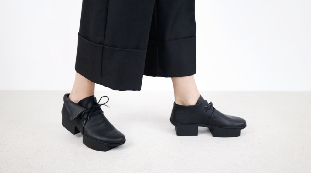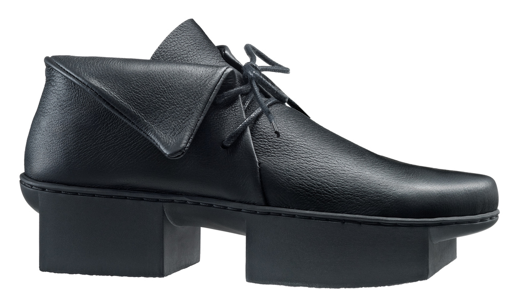 Bei diesem weichen Halbschuh bilden gerade, geometrische Formen ein asymmetrisches und außen umgefaltetes Schnürelement.