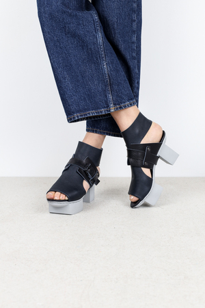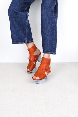 This sandal made of soft leather is secured by a firm strap across the instep and around the sole, while the soft leather wraps around the ankle and is fastened with a hook-and-loop closure.