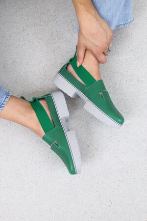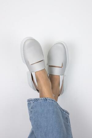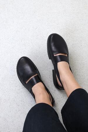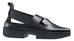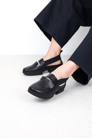 The slipper, made of sturdy leather with a foldable cut behind the toe area, is secured by an elastic band around the heel.