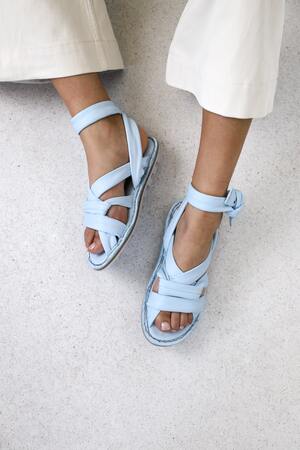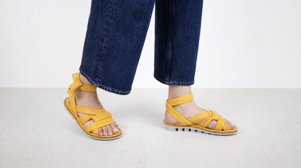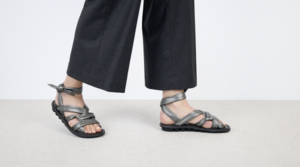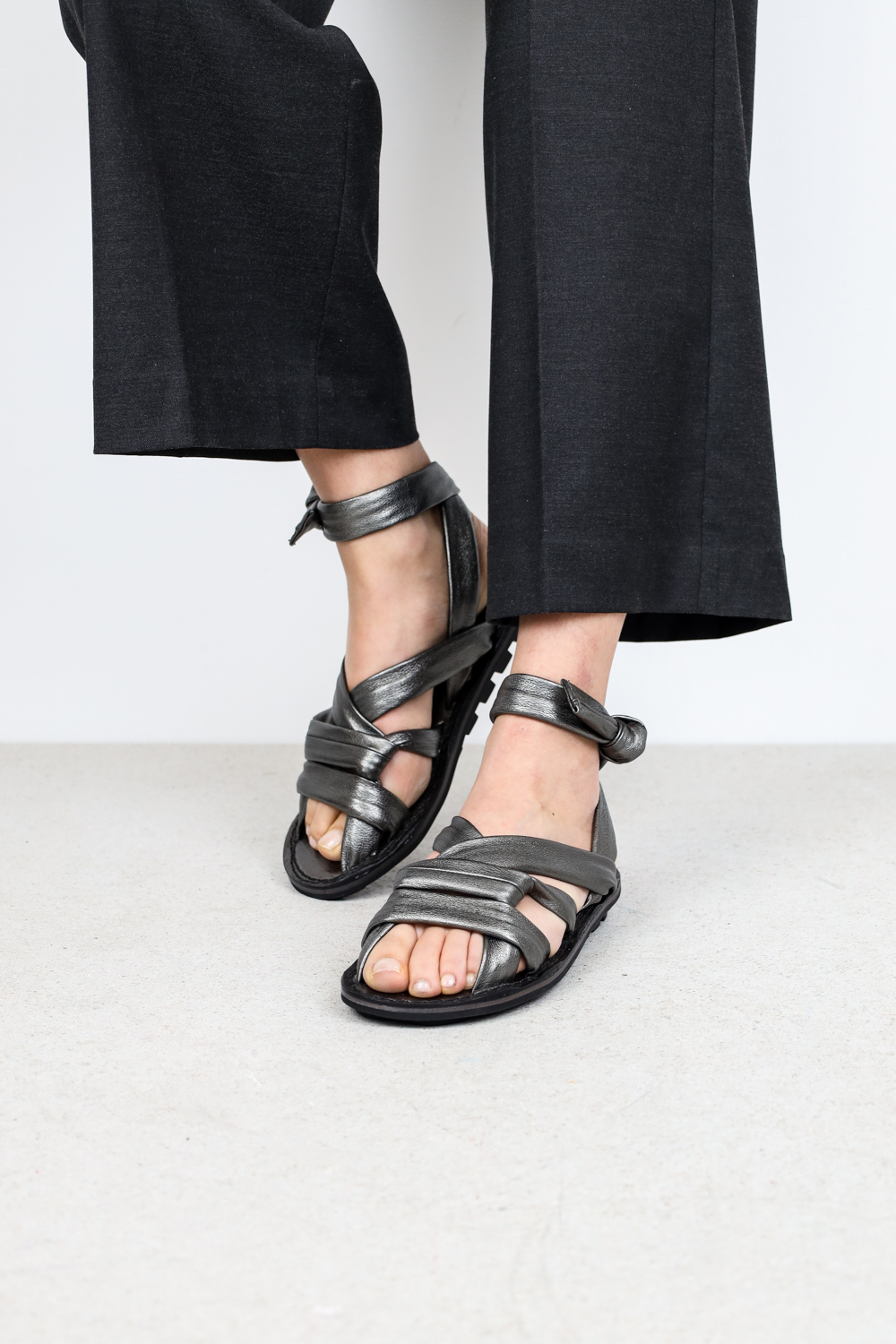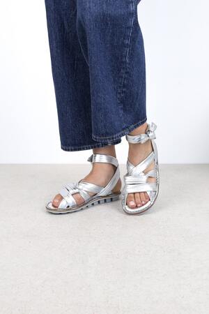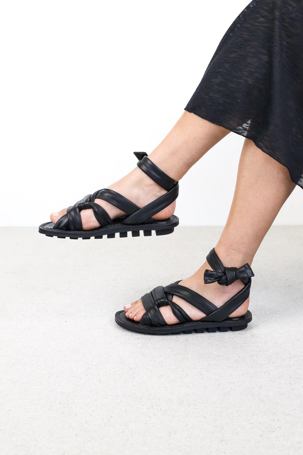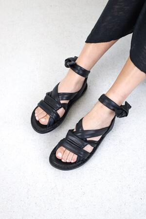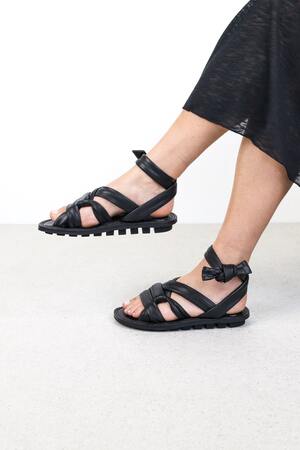 Soft, elegant sandal with intricately interwoven straps that form a playful pattern across the instep and are tied around the ankle.