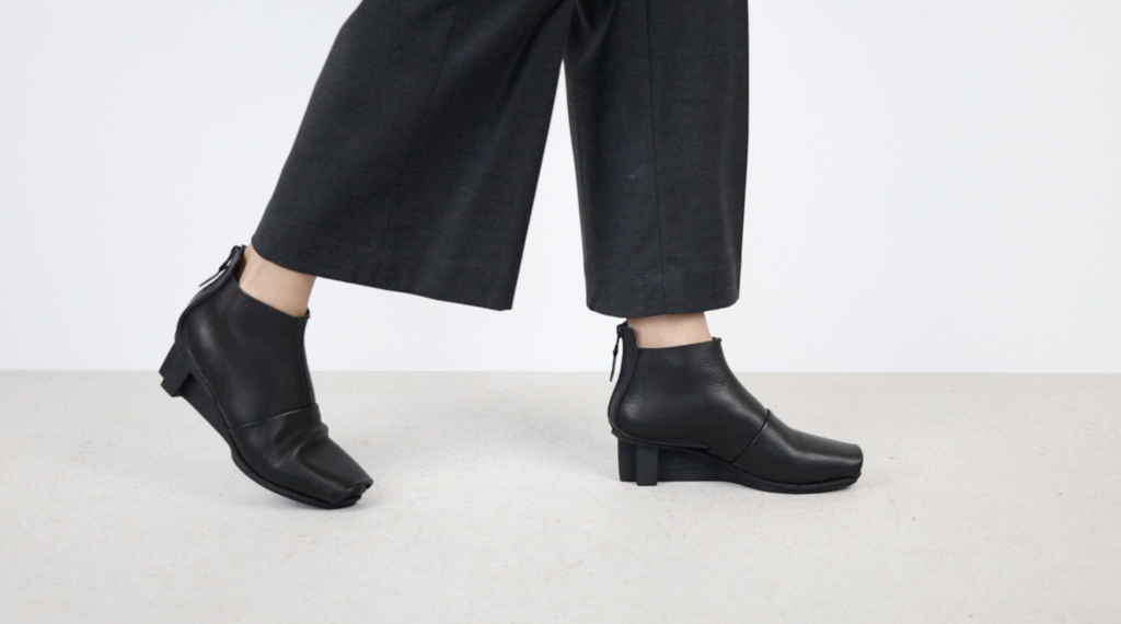 Pure in its form, this unisex ankle boot with semicircular raw seams has a zip at the back.