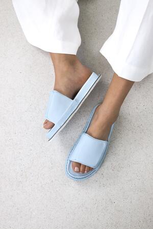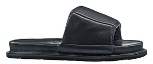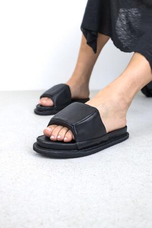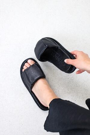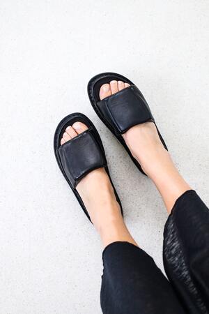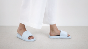 A unisex slipper in which the foot is gently surrounded by an airy, architectural cushion.