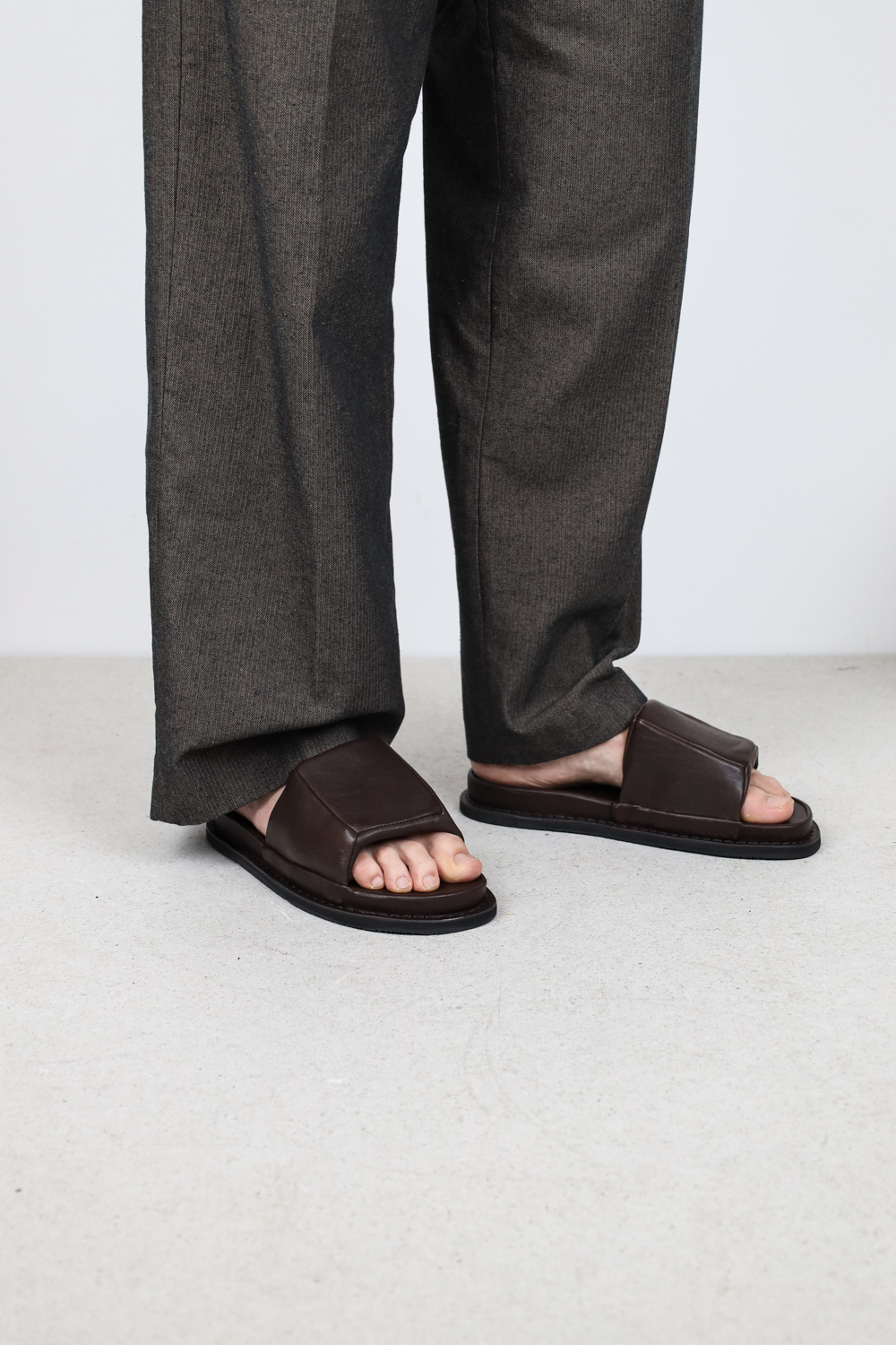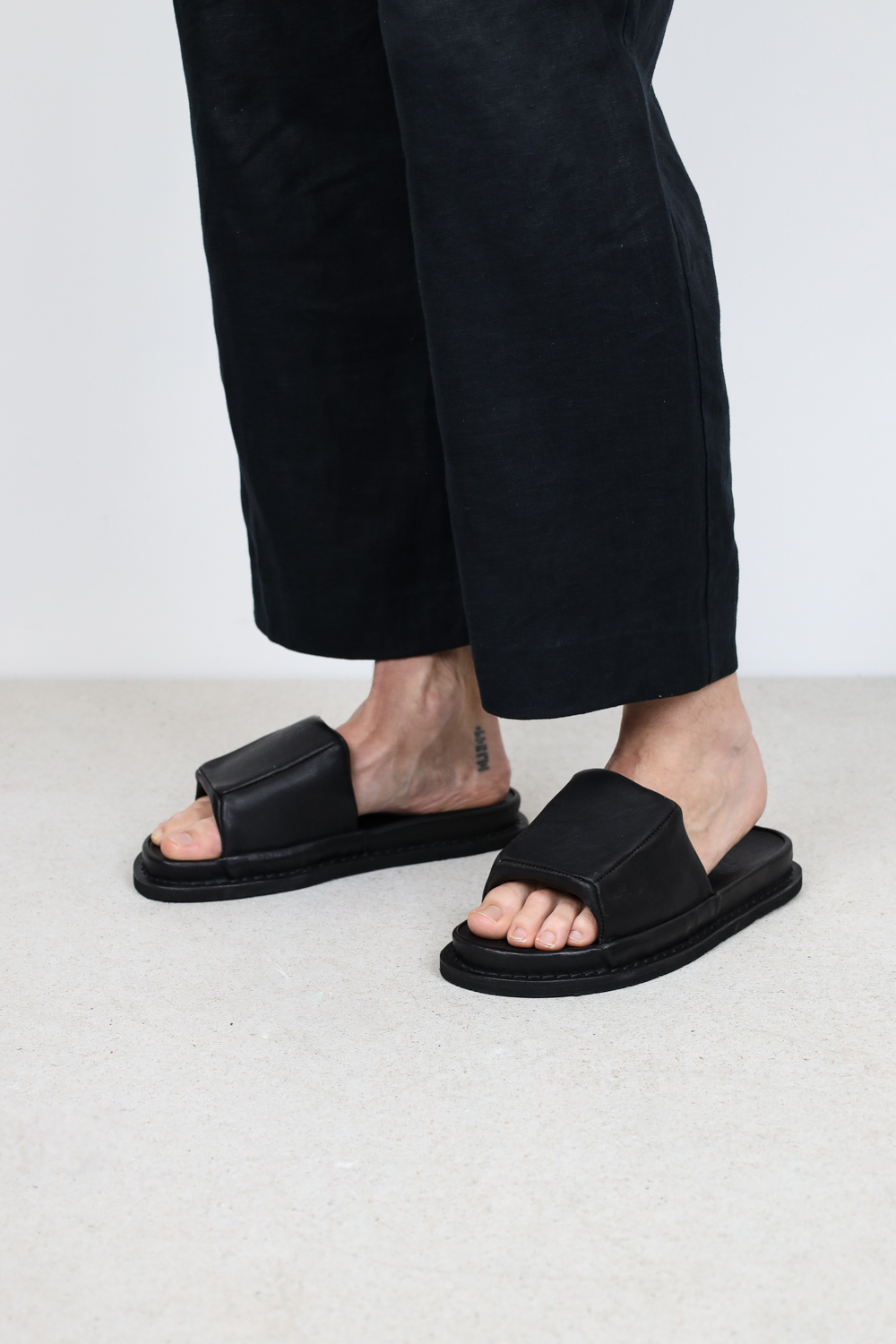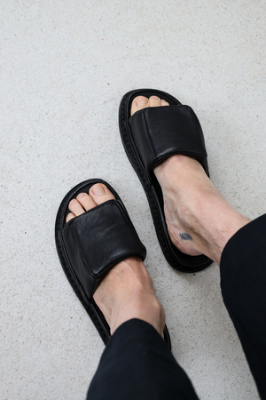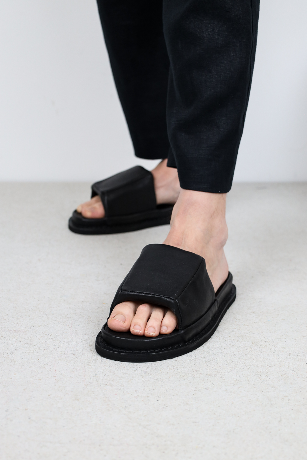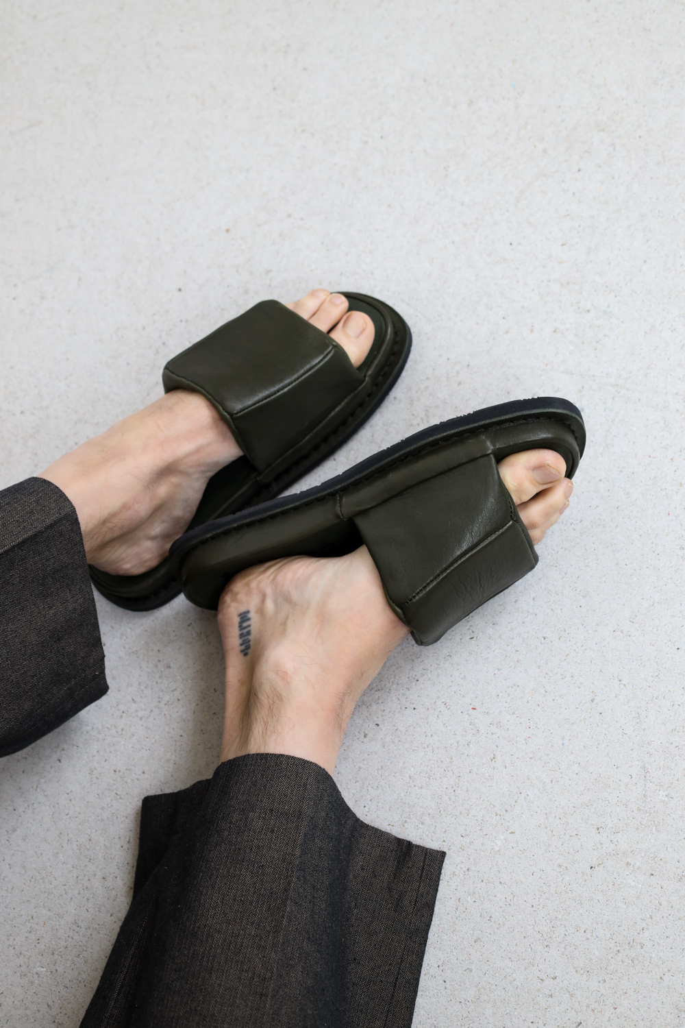 A unisex slipper in which the foot is gently surrounded by an airy, architectural cushion.