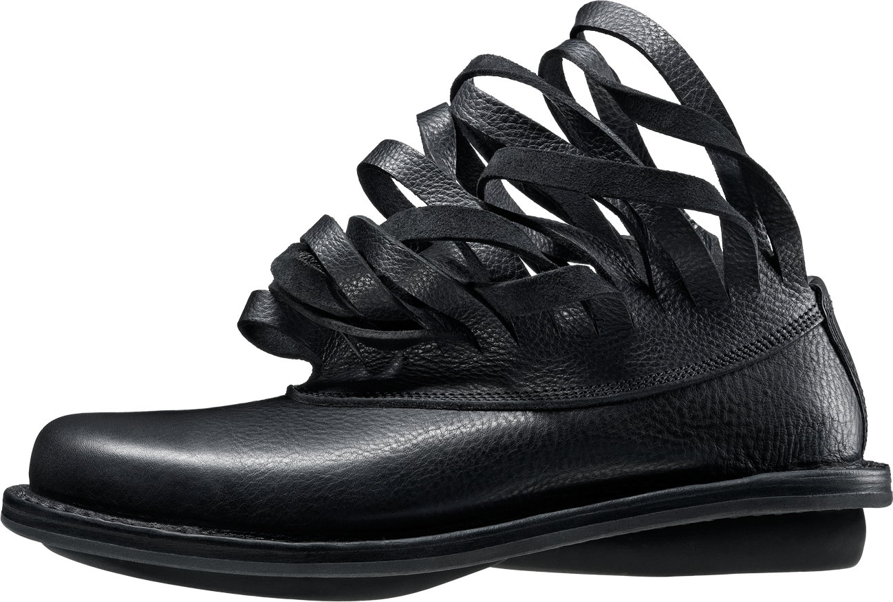 Lines on a weather map come to mind with this experimental model, which you slip into from behind. The arc-shaped insert is cut into narrow straps that follow the instep, and become freely intertwined, as if a storm has swept through them.