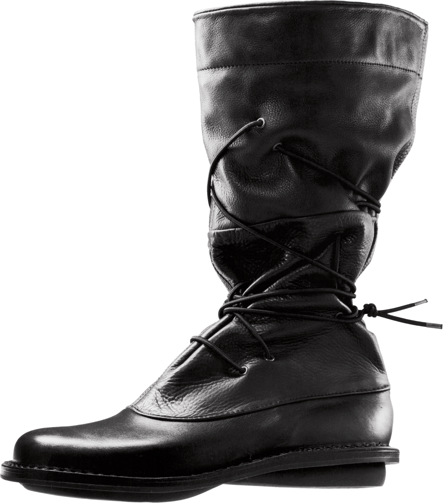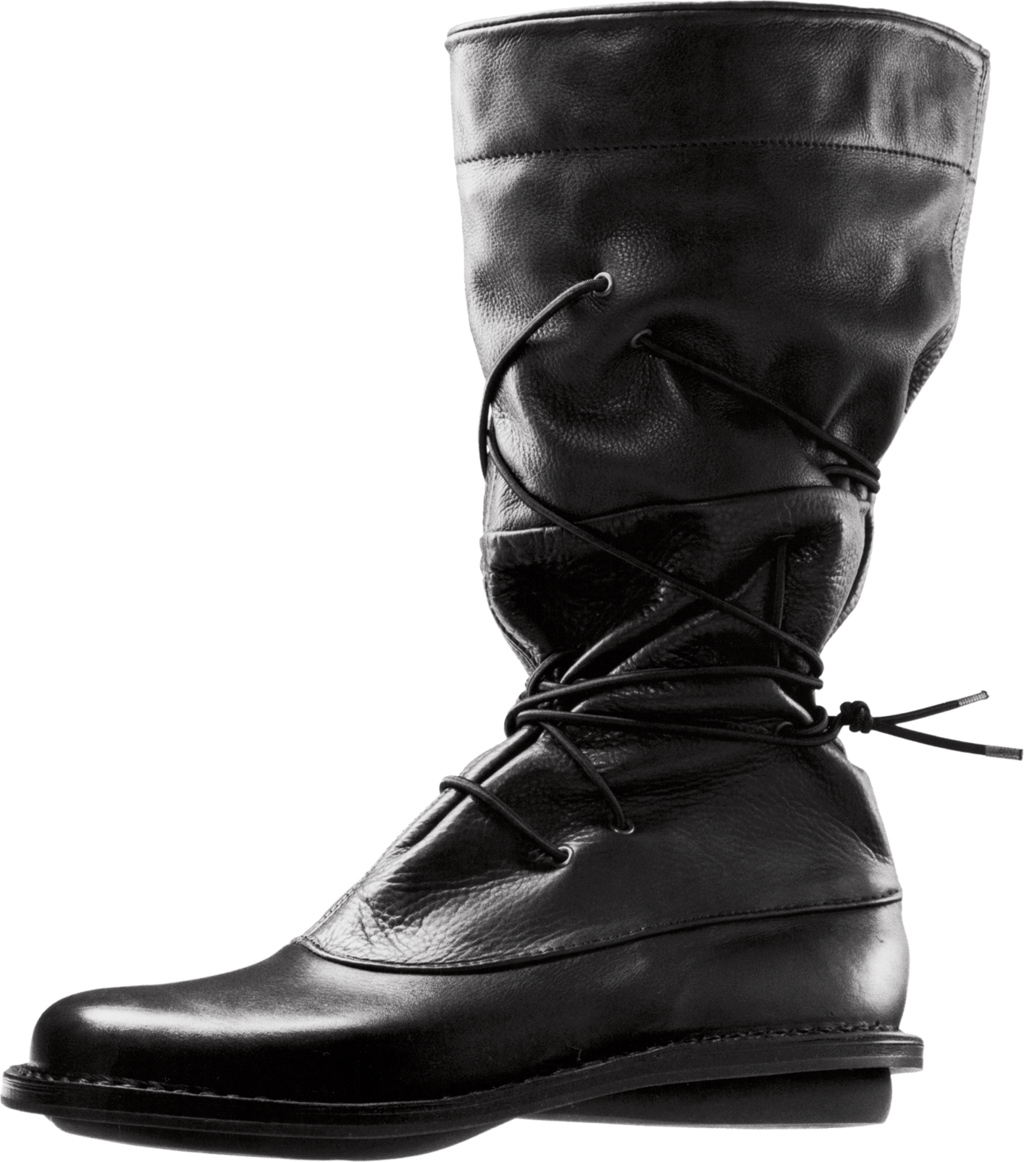 Boot made of super soft leather. Elastic laces threaded through eyelets with virtuosity allow a totally individual way in which to wear this boot. Tight or baggy - as one feels like. The picture shows the style in »black-sft« with »Pamir« sole.