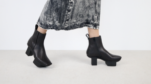 This square-toed style, a combination of skilful cutting and folding techniques, creates a play on the »Happy« range’s signature cube-shaped sole, while the superimposed strip is a subtle nod to club culture.