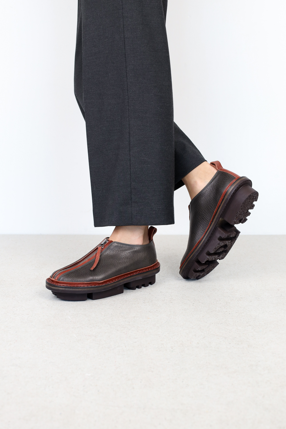 A classic everyday shoe, with a metal zipper running up the middle, that is not only decorative but also functional to wear.