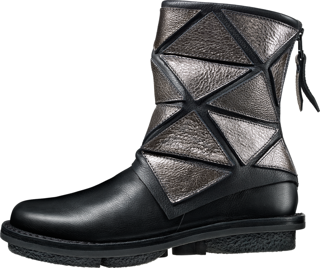 Ankle boot with relatively widely cut leg, made of two leathers, with a zip fastener at the heel. The triangular appliqués made of stronger leather are flexible in various directions thanks to the softer underlay, and are thus reminiscent of a kinetic object. For information regarding other possible colour combinations, please contact our customer service.