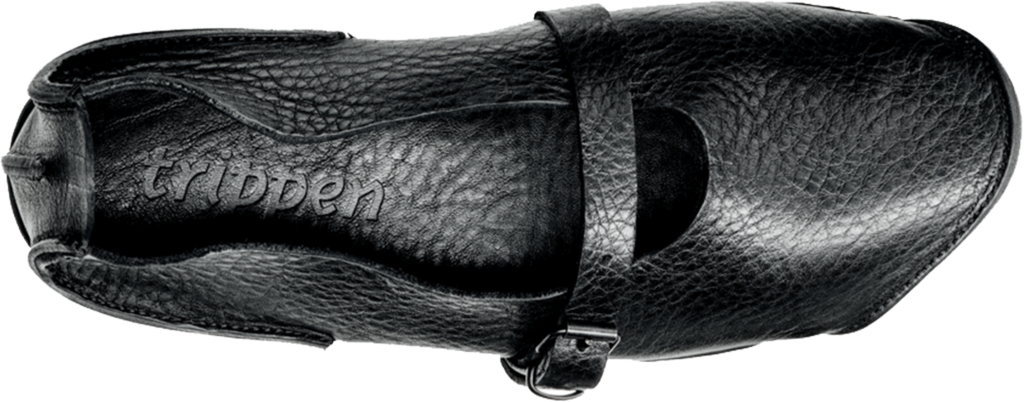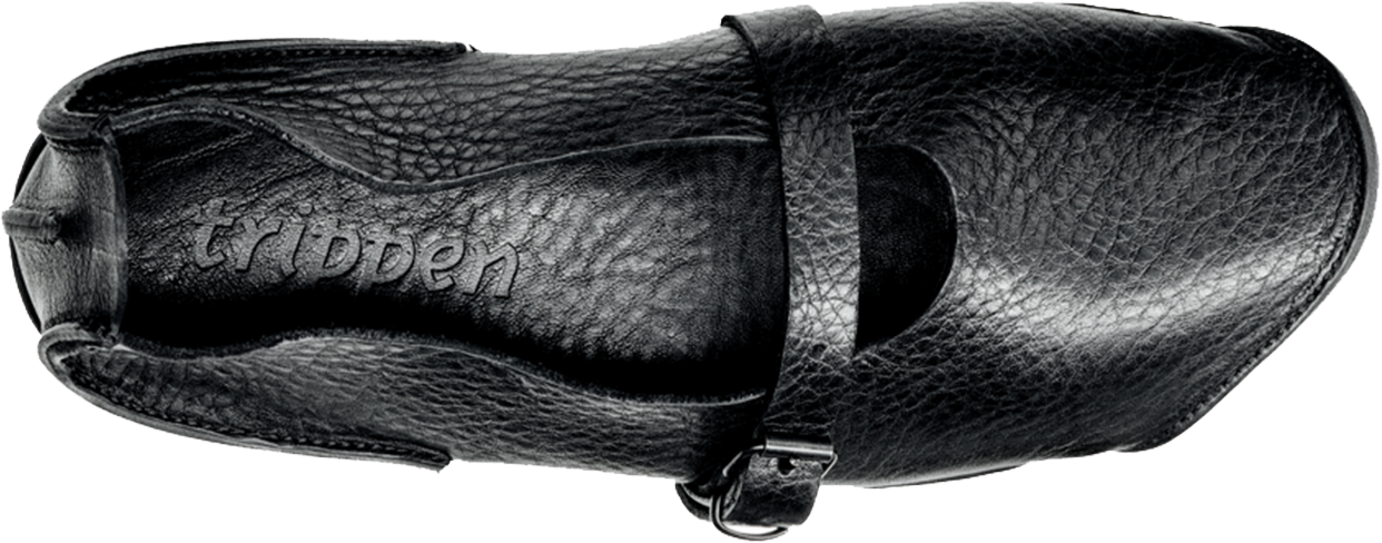 The idea for this buckle shoe with round raw seam at the tip comes from old-fashioned »Kuhmaul« shoes - hence its name.