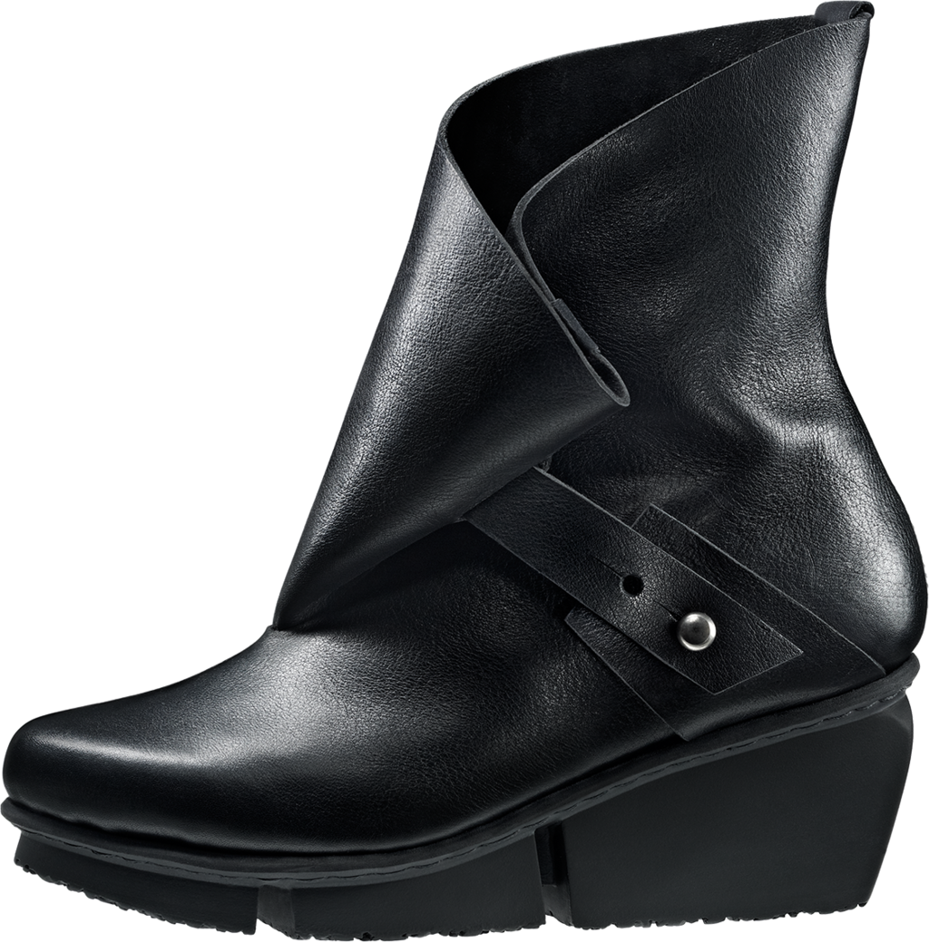 Ankle boot with dynamic silhouette. The elaborately folded upper with extra-large button fastening is curved elegantly like a sun sail. The lower strap guarantees a firm hold.