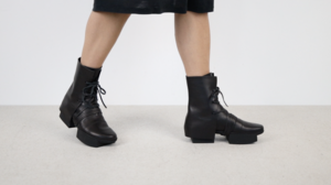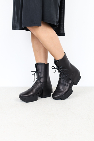 Avant-garde plateau ankle boots with graphic elements and unusual leather lacing.
