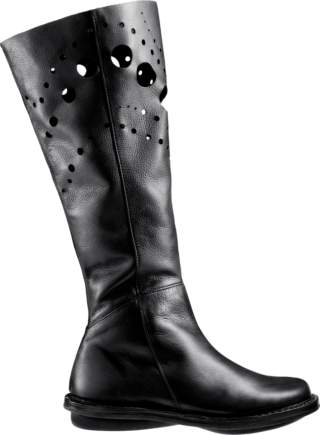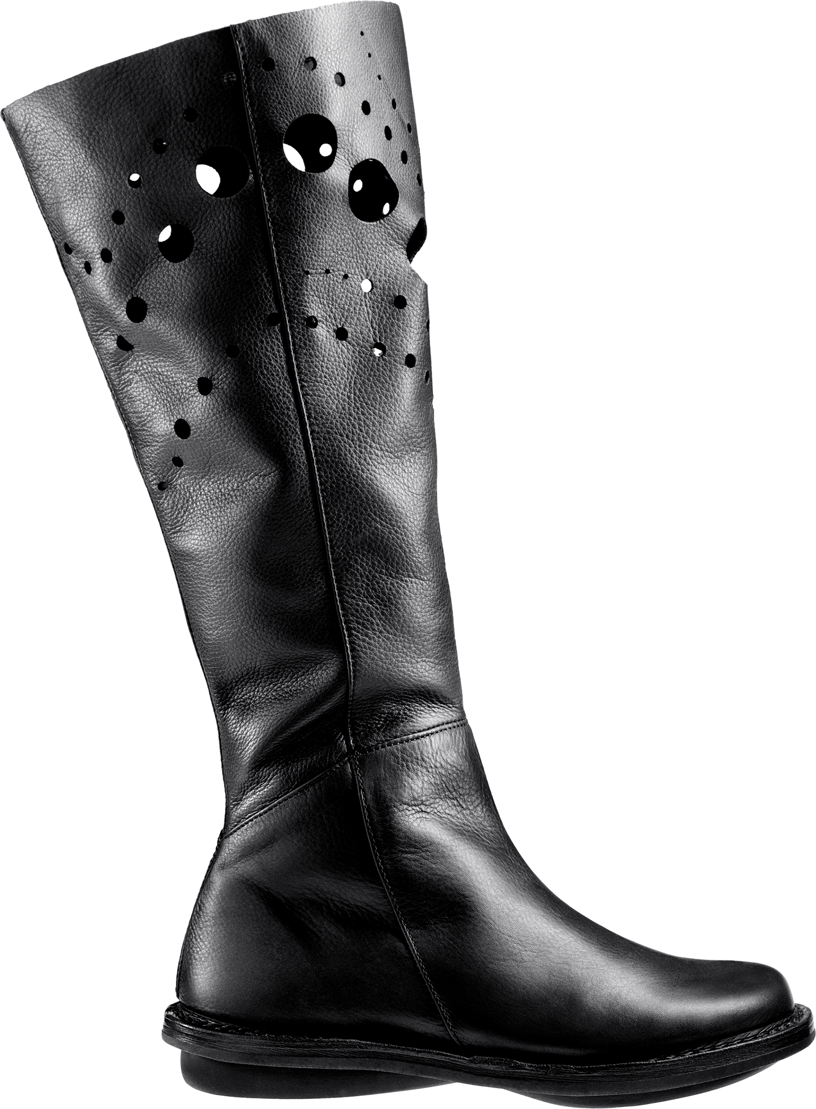 Knee-high boot made from soft leather with iner zip fastener that fits tight around the ankle. The hole pattern is inspired by the marks on an iguana´s skin.