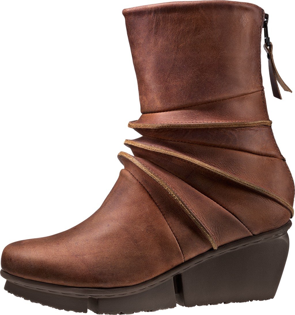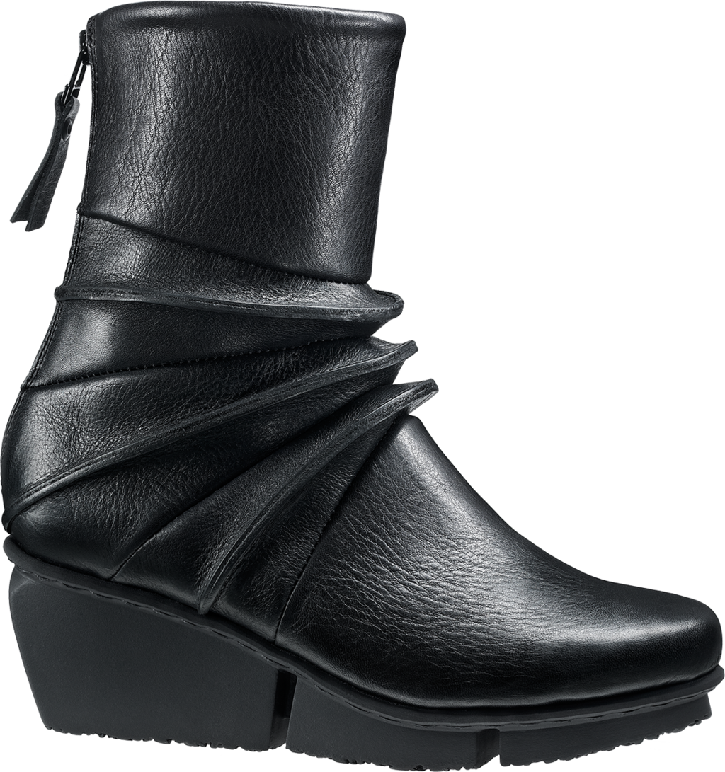 Architectural ankle boot with zip fastener at the heel. The upper fans out like a concertina. The form-giving raw seams create an elegant contour.