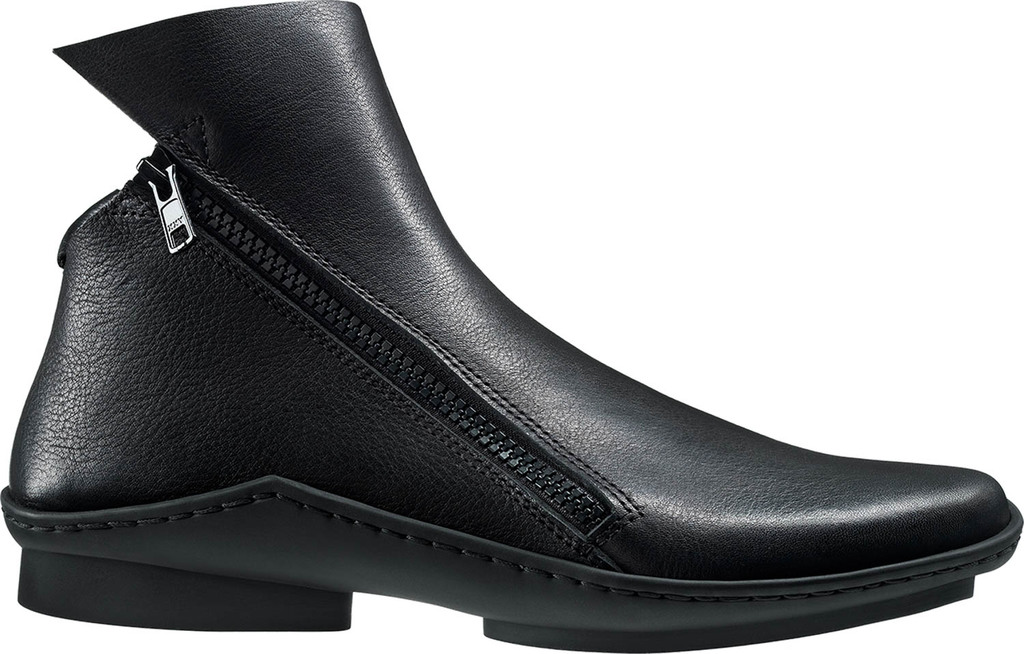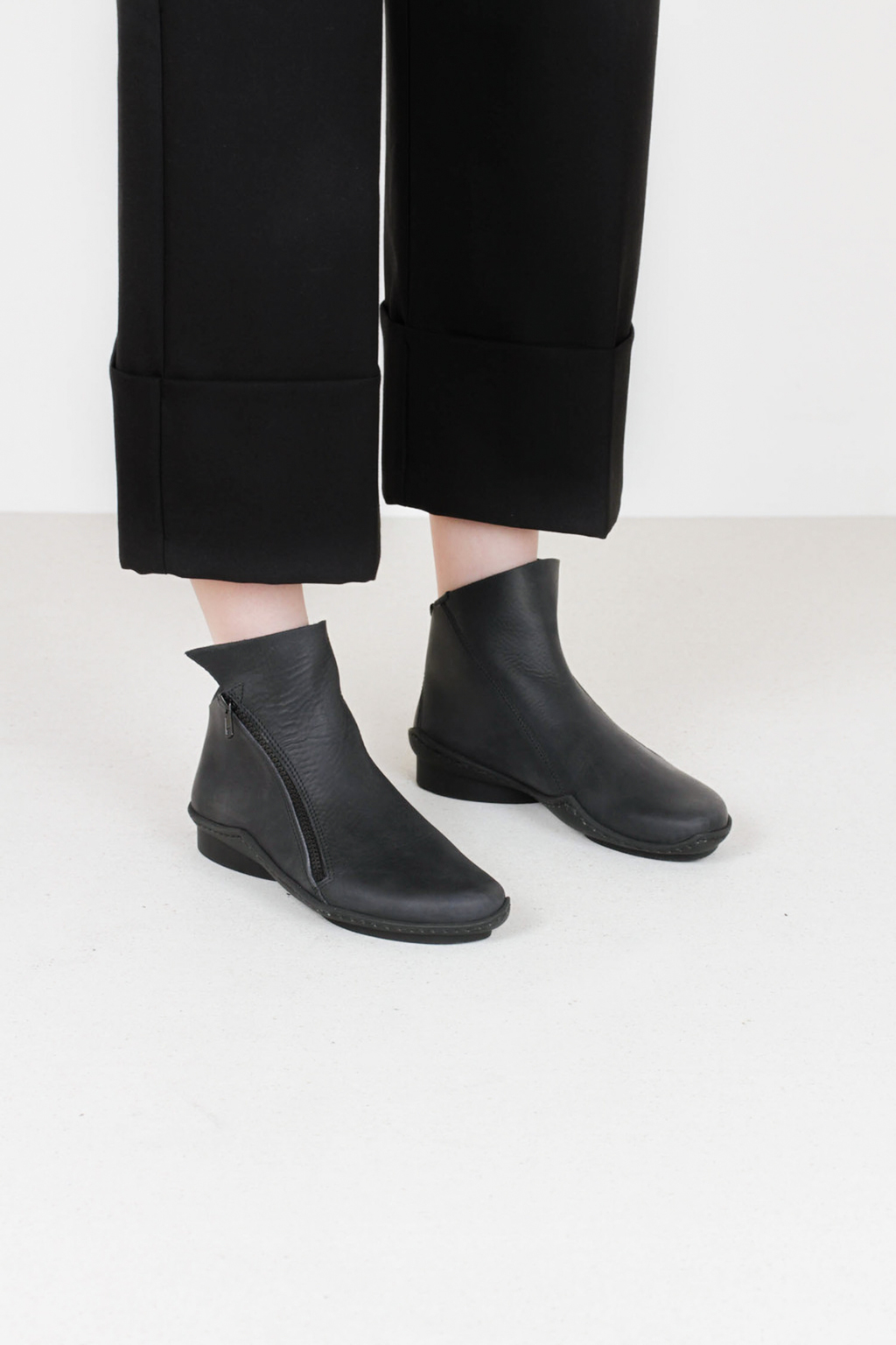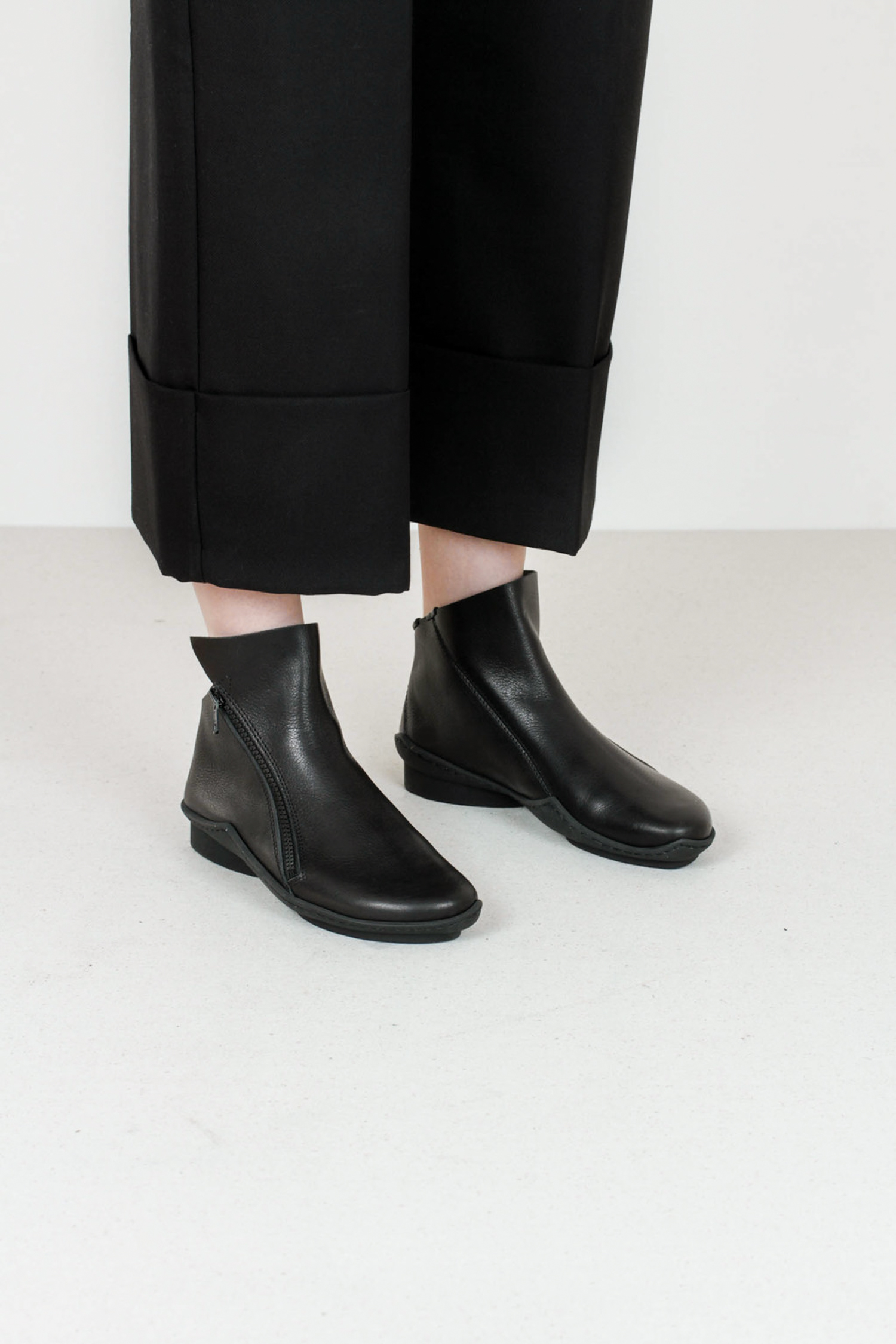 Unlined sporty, yet elegant bootie with a dynamic spiral-shaped design and a wide diagonal plastic zip on the outside.