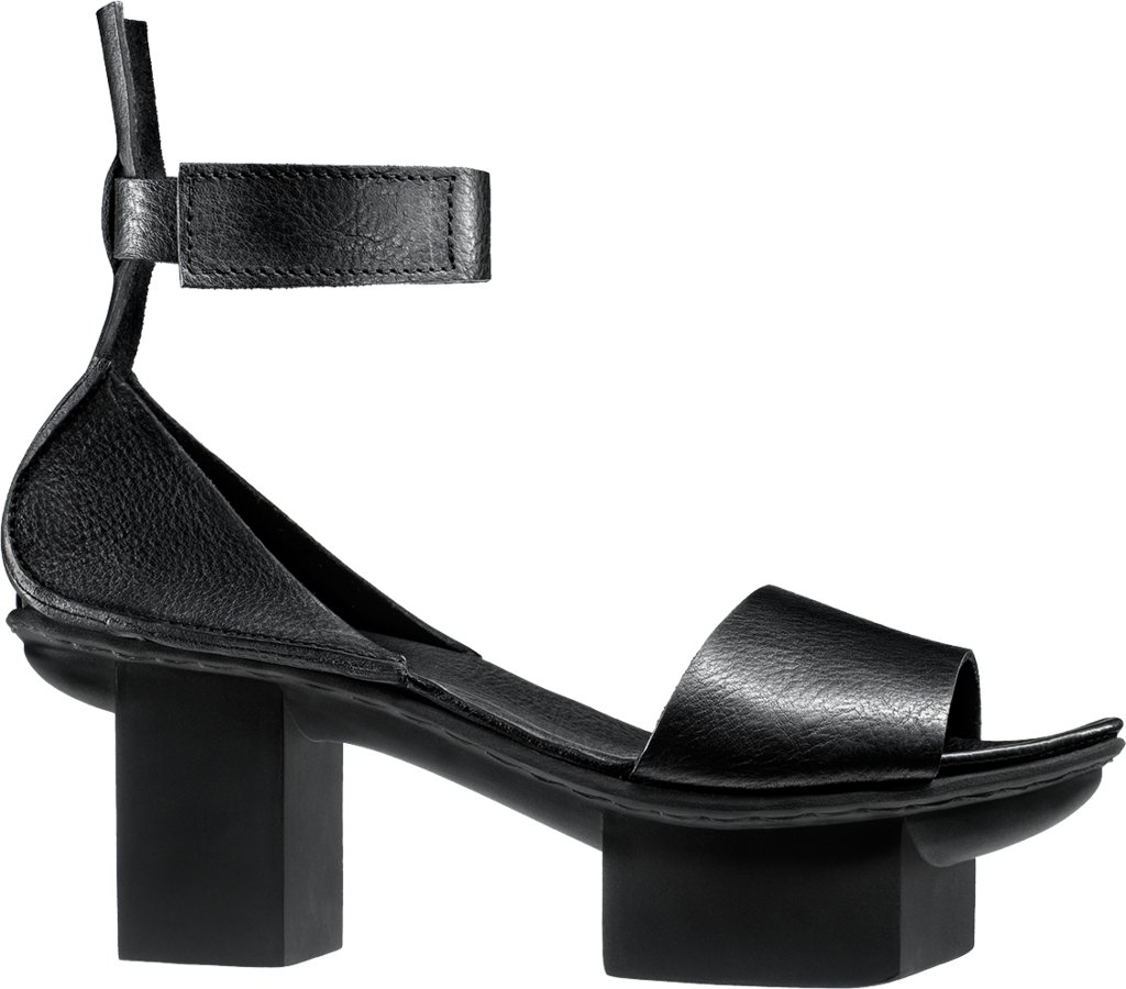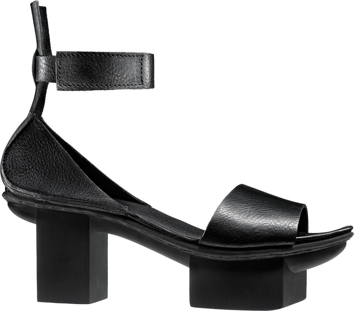 Sandal with trapeze-shaped ankle strap that is cut wide open across the instep.